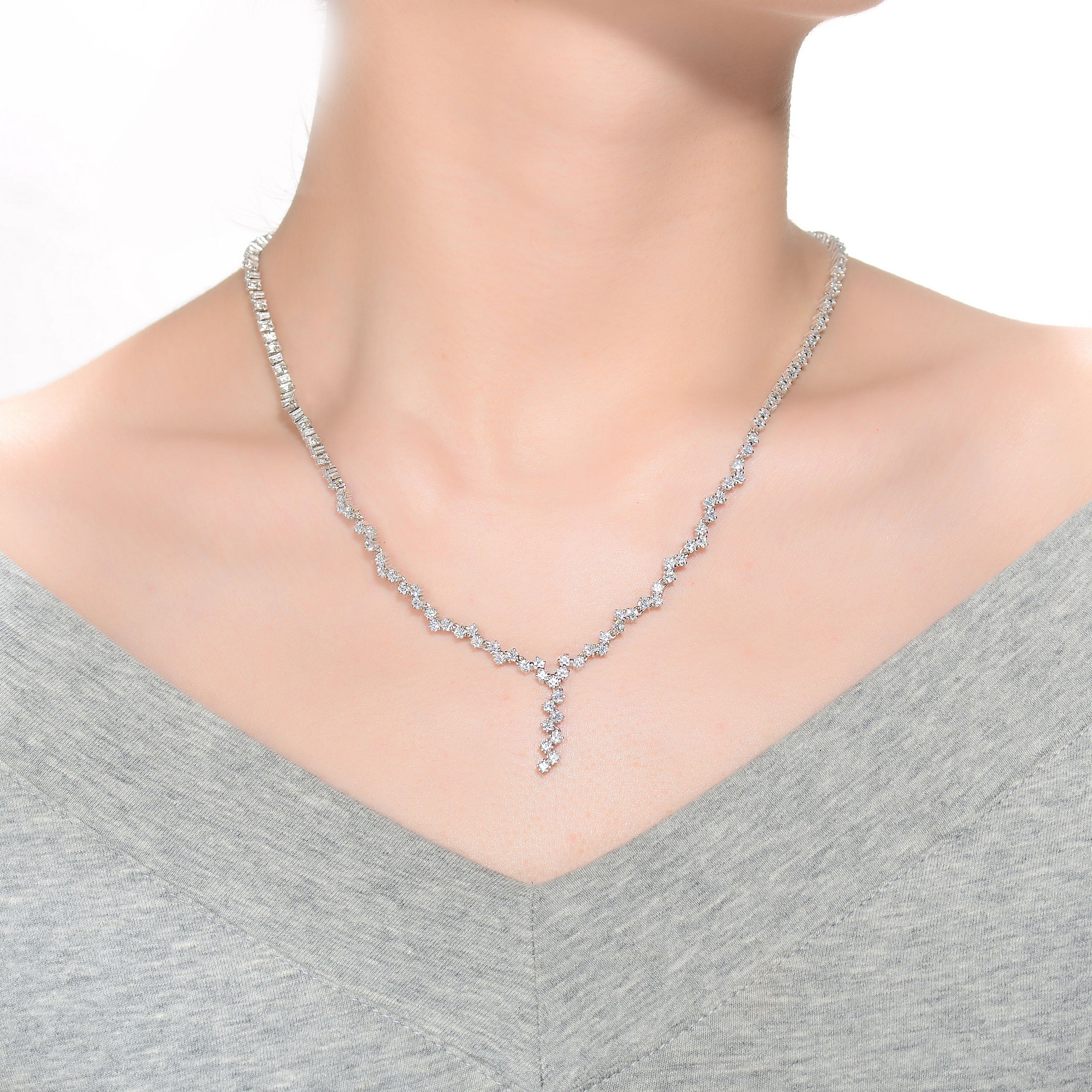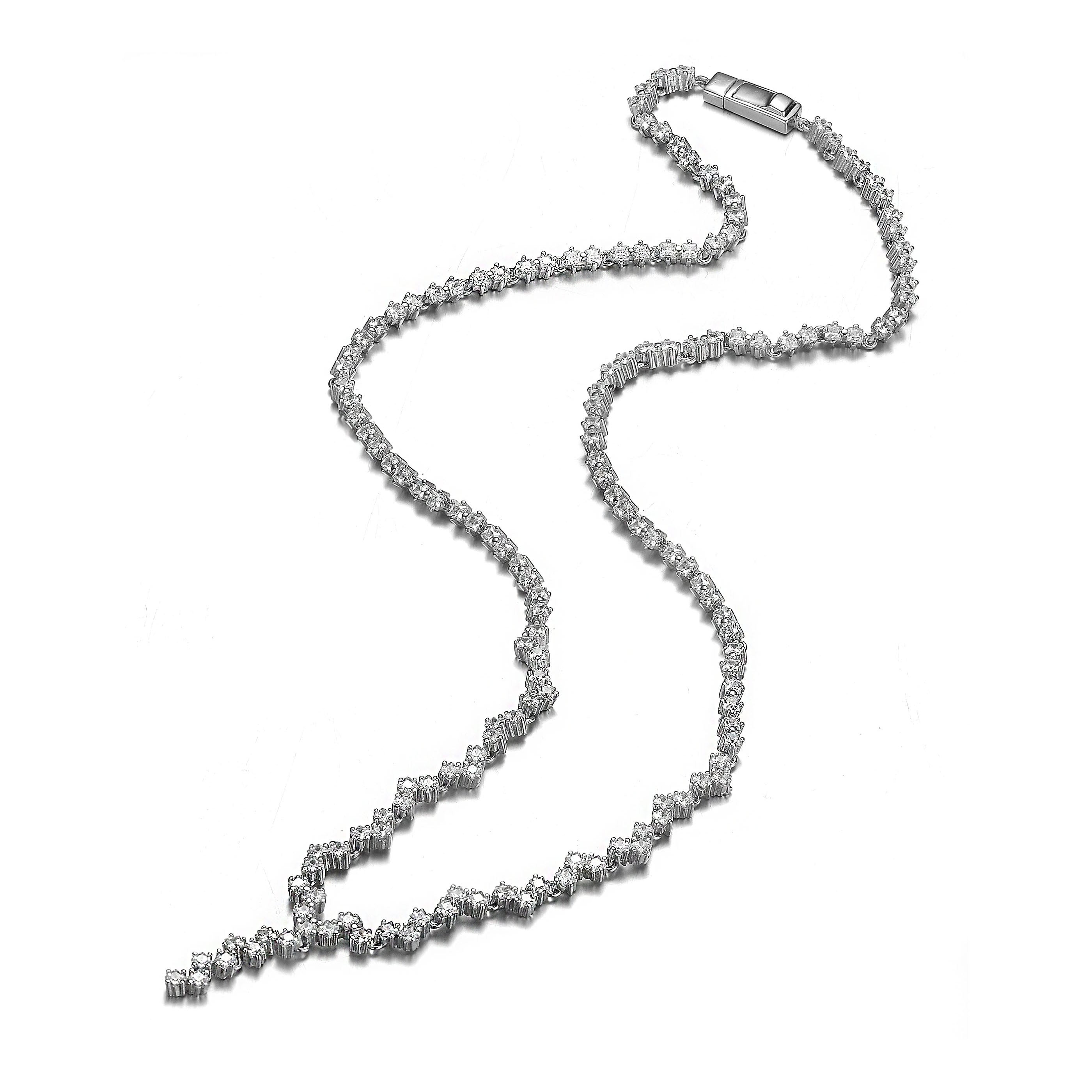 A playful design composed of clear princess Cubic Zirconia in a subtle zigzag pattern is the main feature of this Sterling silver with Rhodium plated necklace. This necklace is perfect to accessorize your daily outfit. This also secures aith a slide clasp.