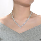 This stylish necklace features a pave of clear round Cubic Zirconia in diagonal pattern to form several arrow head-inspired design. Crafted of Sterling silver with Rhodium plated, this stylish necklace shines with a highly polished finish and secures with a box clasp.