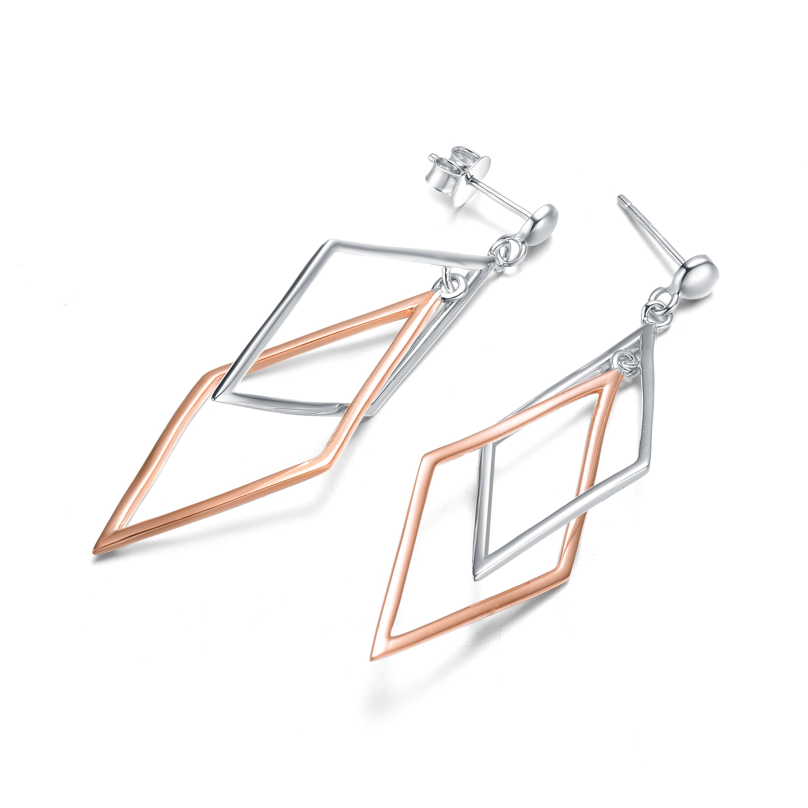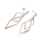 These bold rhombus earrings bring graphic elegance to any look. The elongated silhouette creates fluid movement with each step. Two-tone plating adds depth and modern contrast. Crafted in sterling silver, they maintain a polished finish throughout wear. Lightweight construction ensures comfort despite the dramatic length. Perfect for elevating casual outfits with statement style.