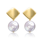 sterling Silver 14k Yellow Gold Plated with White Coin Pearl Double Dangle Square Earrings. These glamorous 14k yellow gold plated sterling silver dangle earrings are all you need to complete your look. Shimmering white coin pearls (June Birthstone) on the bottom dangle from geometric tops on the top, adding graceful movement and length, perfect for adding an elegant detail to your day or night style. Butterfly back keep these pearl earrings secure, all crafted in a luscious, rich shine.