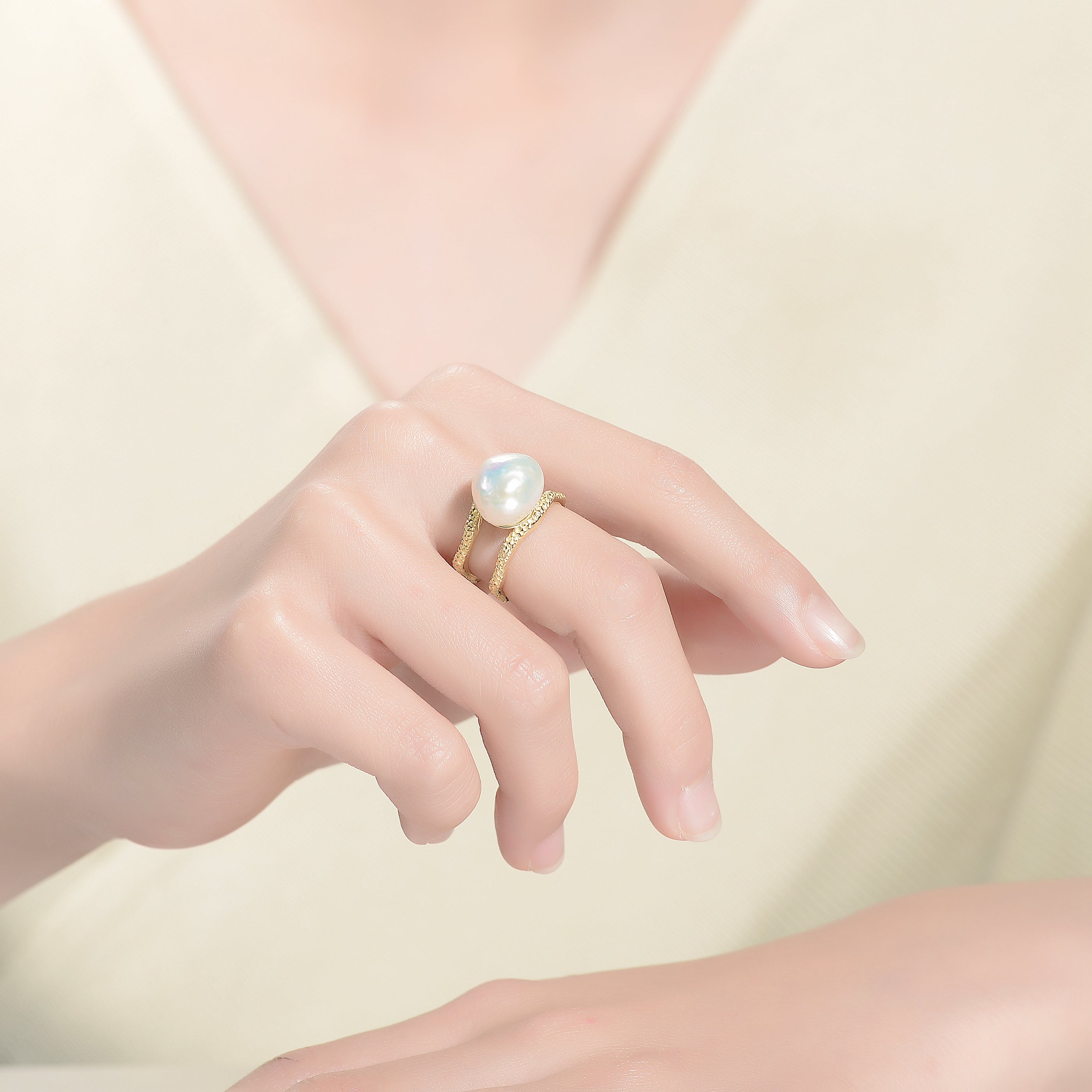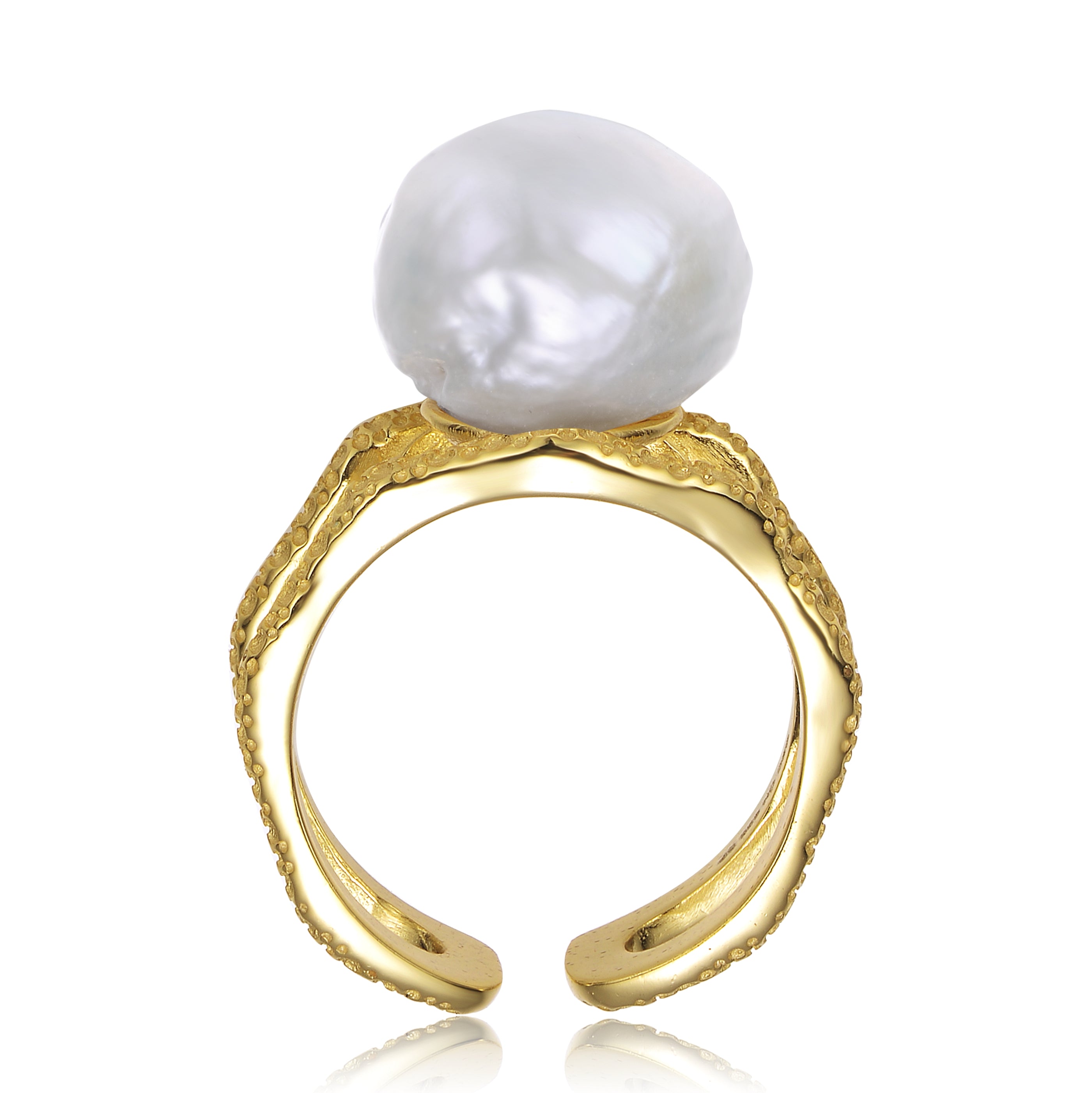 This contemporary ring features a bold button freshwater pearl set atop uniquely sculpted shanks. Crafted from sterling silver and finished with rich gold plating, it delivers a modern yet elegant presence. The asymmetrical structure adds visual interest while highlighting the pearl’s natural luster. Designed to stand out, this ring works beautifully as a statement piece. Its artistic silhouette brings character and refinement to everyday styling. A distinctive design that blends organic beauty with modern craftsmanship.