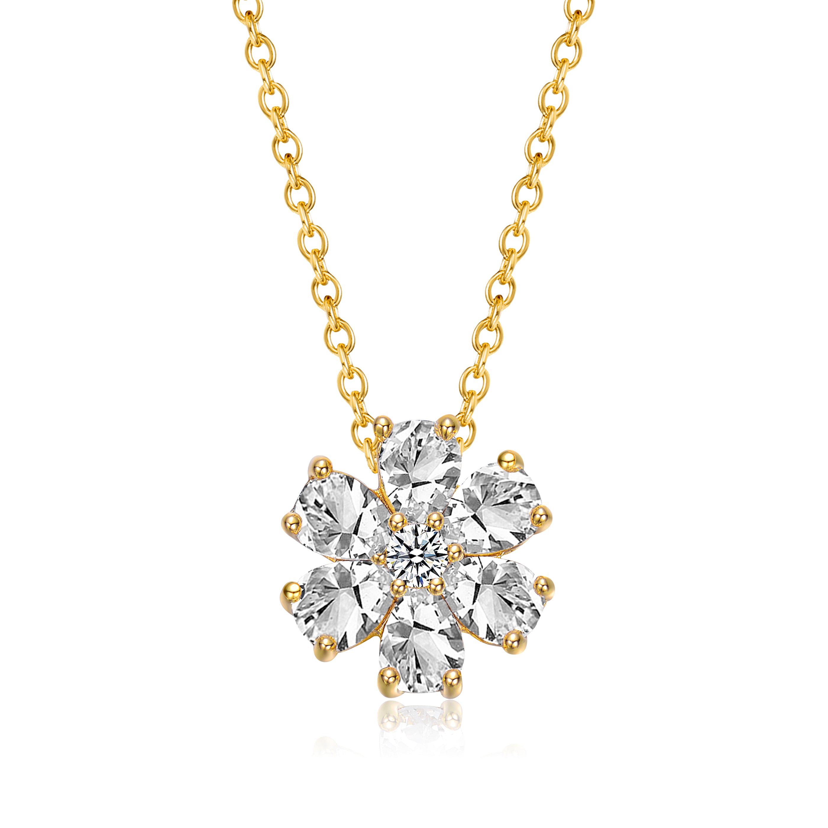This exquisite pendant showcases a cluster of moissanite stones set in sterling silver with a radiant gold plating. The central stone takes center stage, surrounded by smaller moissanites arranged in a symmetrical floral pattern. The brilliance of the moissanite gems rivals that of diamonds, making this pendant an affordable yet luxurious choice. Suspended from a gold-plated chain, it combines the timeless appeal of precious metals with the captivating sparkle of moissanite. Whether worn for special occasions or as an everyday statement piece, this pendant exudes elegance and sophistication