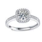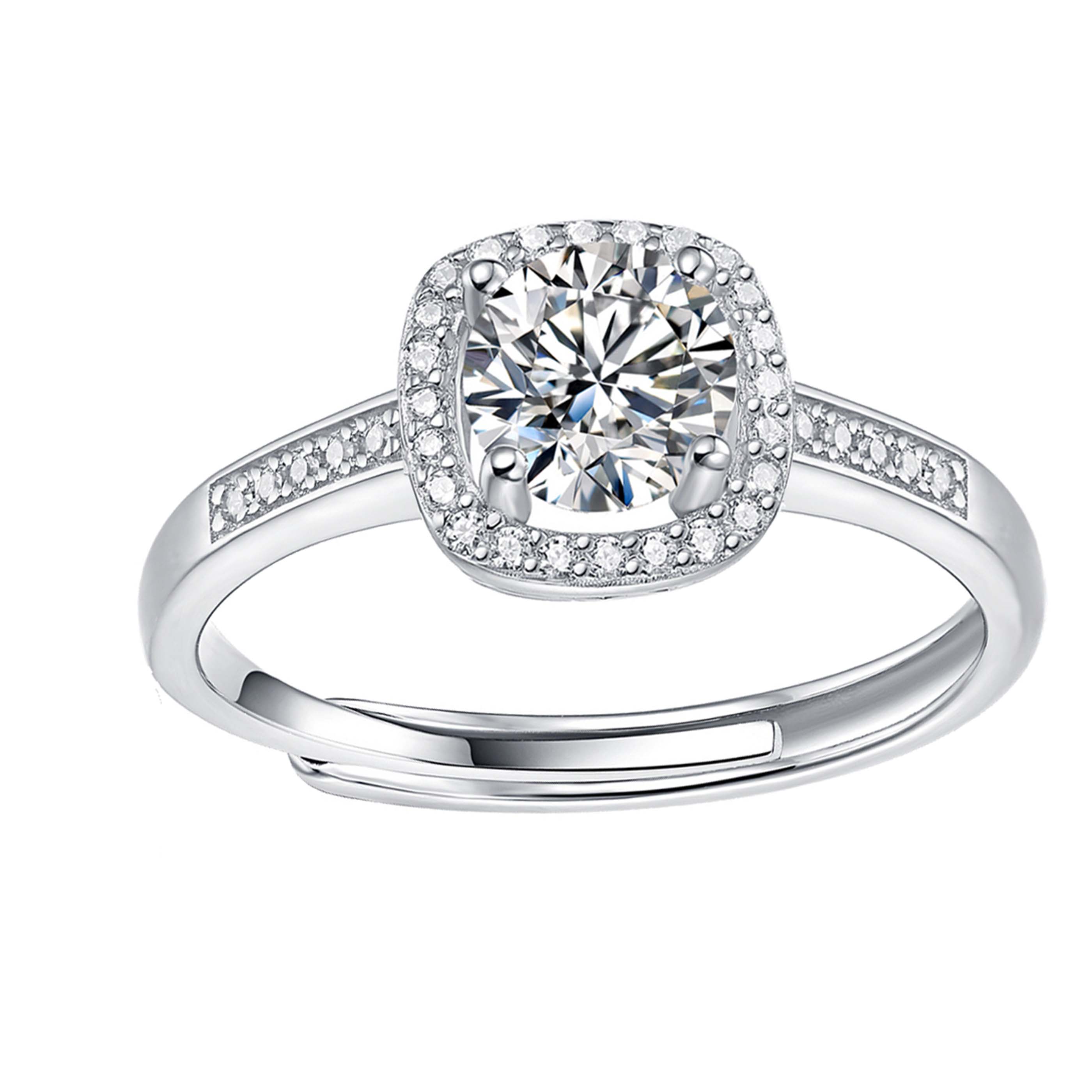 Sterling Silver 0.50ct Princess Lab-Grown Moissanite Halo Engagement Ring. This show-stopping sterling silver engagement ring features a lab-grown moissanite solitaire secured in the center of a cushion-shaped halo sparkling with pave set round brilliant cut lab-grown moissanite. Additional lab-grown moissanite encrusted on the band finish the look of this timeless style, making it the perfect selection for those who seek an eco-friendly choice for their engagement ring. Beautifully crafted in a brightly polished finish. Ring is adjustable in size, accommodating different ring sizes.