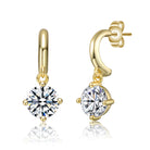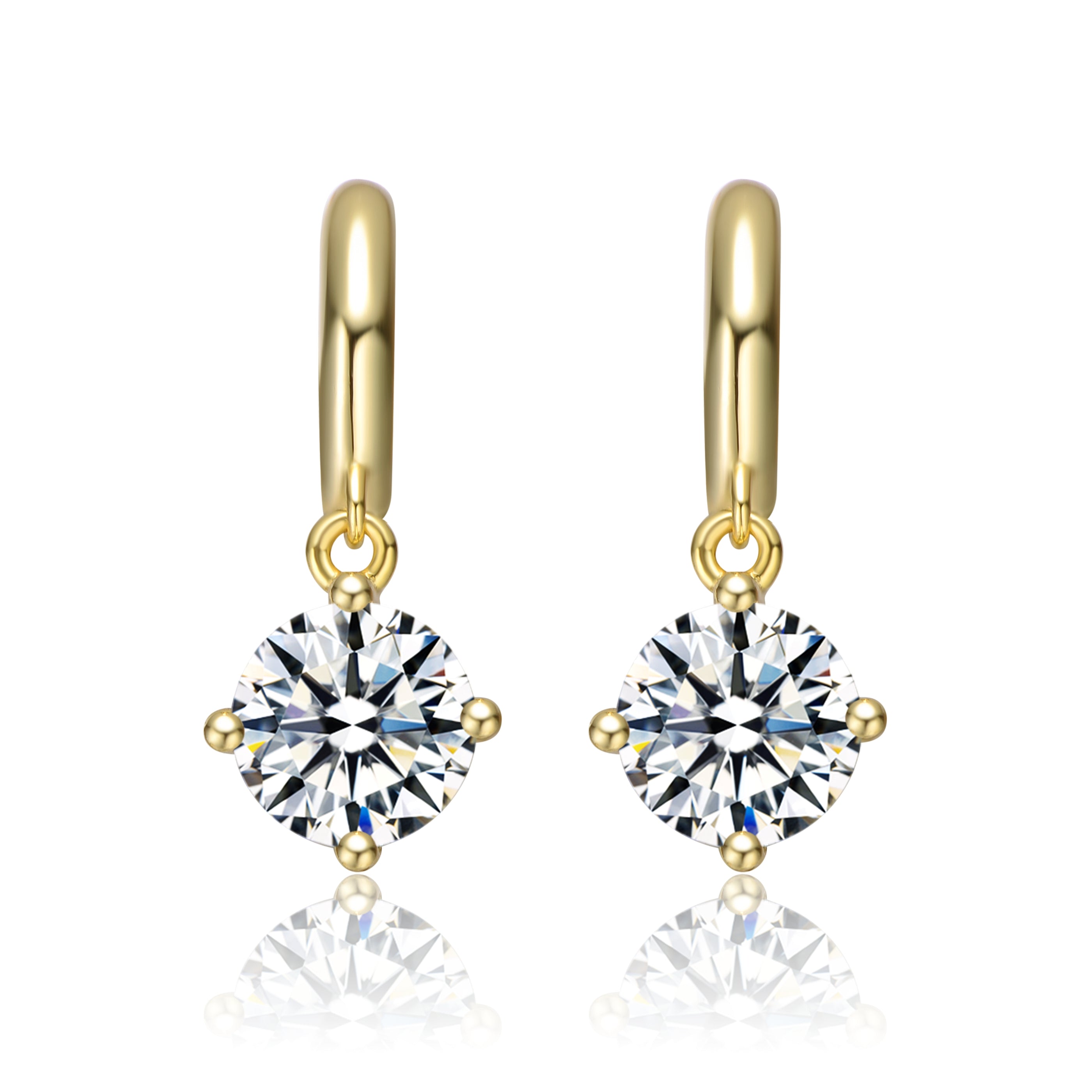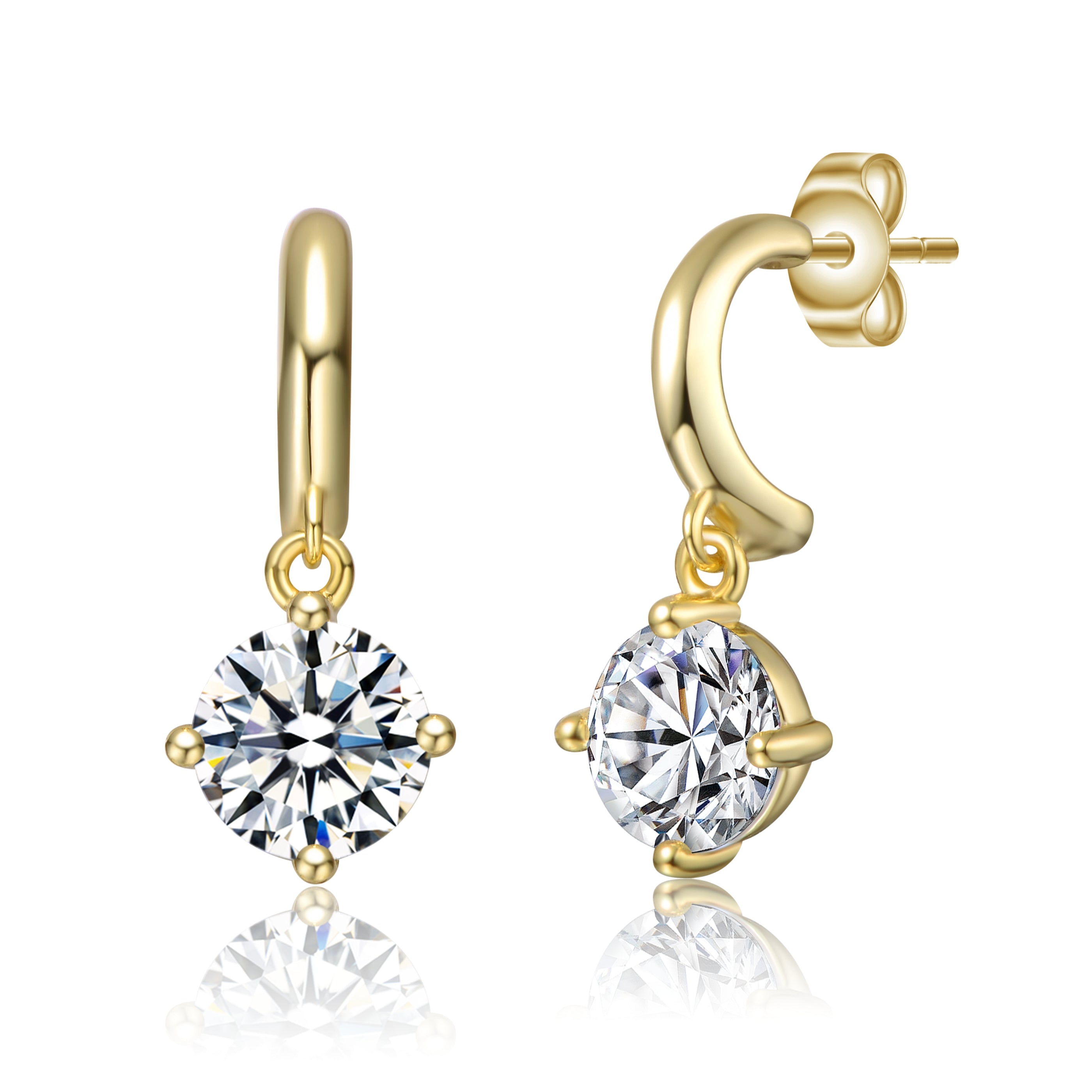 Sterling Silver 14k Gold Plated with Lab Created Moissanite Solitaire C-Hoop Dangle Earrings. Sterling Silver 14k Gold Plated with Lab Created Moissanite Solitaire C-Hoop Earrings. These dainty c-hoop earrings feature sparkling round brilliant cut lab created moissanite solitaire stones secured in classic four-prong settings dangling with movement. Butterfly push backs keep these petite earrings securely on the ears, all finely crafted in sterling silver with rich 14k gold plating. Mix and match these pretty dangle hoop earrings with other gold plated jewelry, pulling your look together with elegance and unique style.
