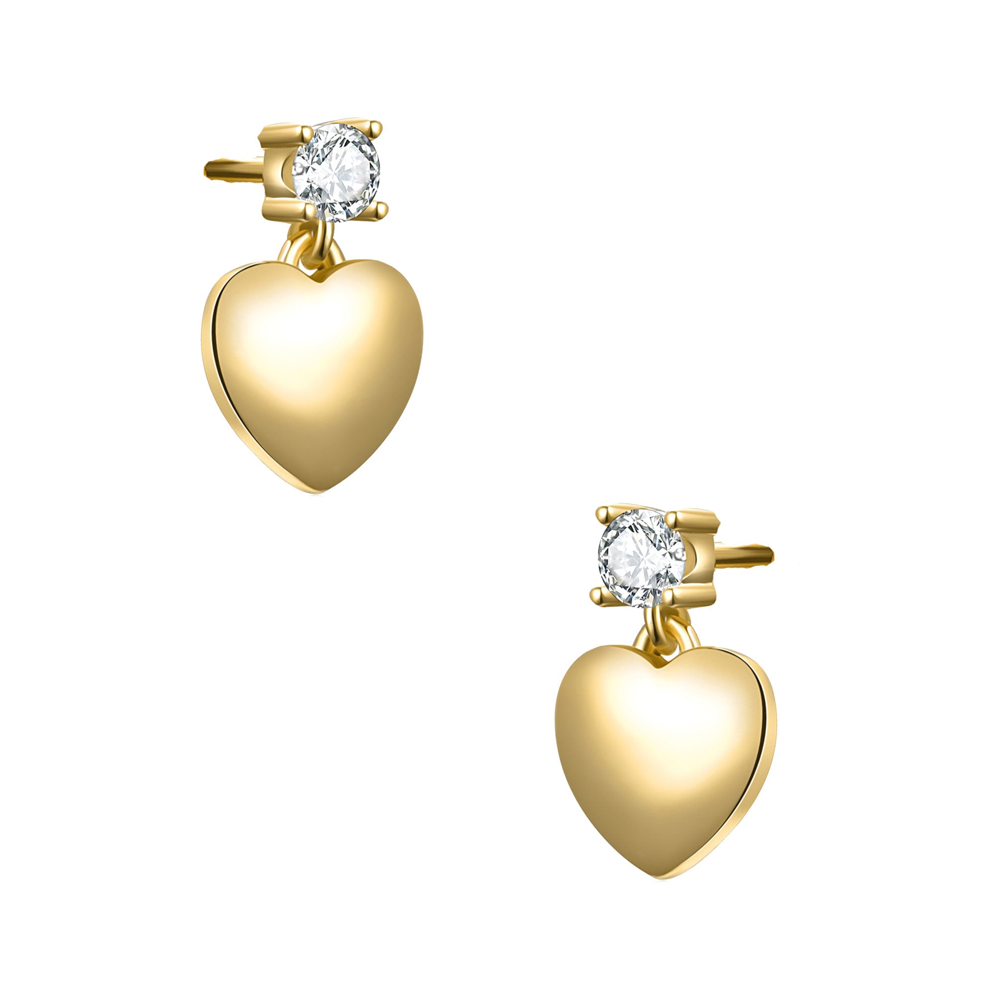 Sterling Silver 14k Yellow Gold Plated with 0.30ctw Lab Created Moissanite Heart Dangle Earrings. These super-sweet stud earrings feature sparkling round brilliant cut lab created moissanites prong set on the top of hearts, totaling 0.30ctw. These moissanite stones have VVS1 clarity and D color, glittering in prong settings. Butterfly backs keep these heartfelt earrings secure, all finely crafted in 14k yellow gold plated sterling silver with a rich, luscious shine. Perfect for wearing as an understated style or highly accessorized look with other jewelry.