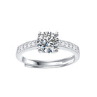 Sterling Silver 1ct Lab-Grown Moissanite Pave Engagement Ring. This breathtaking sterling silver engagement ring features a round brilliant cut lab-grown moissanite solitaire secured in a four-prong setting in the center. Glistening round brilliant cut lab-grown moissanites add fire to the band, making this beautiful engagement ring the perfect choice for those who love a classic elegance combined with the modernity of lab-grown stones and high-quality design. Ring is adjustable in size, accommodating different ring sizes.