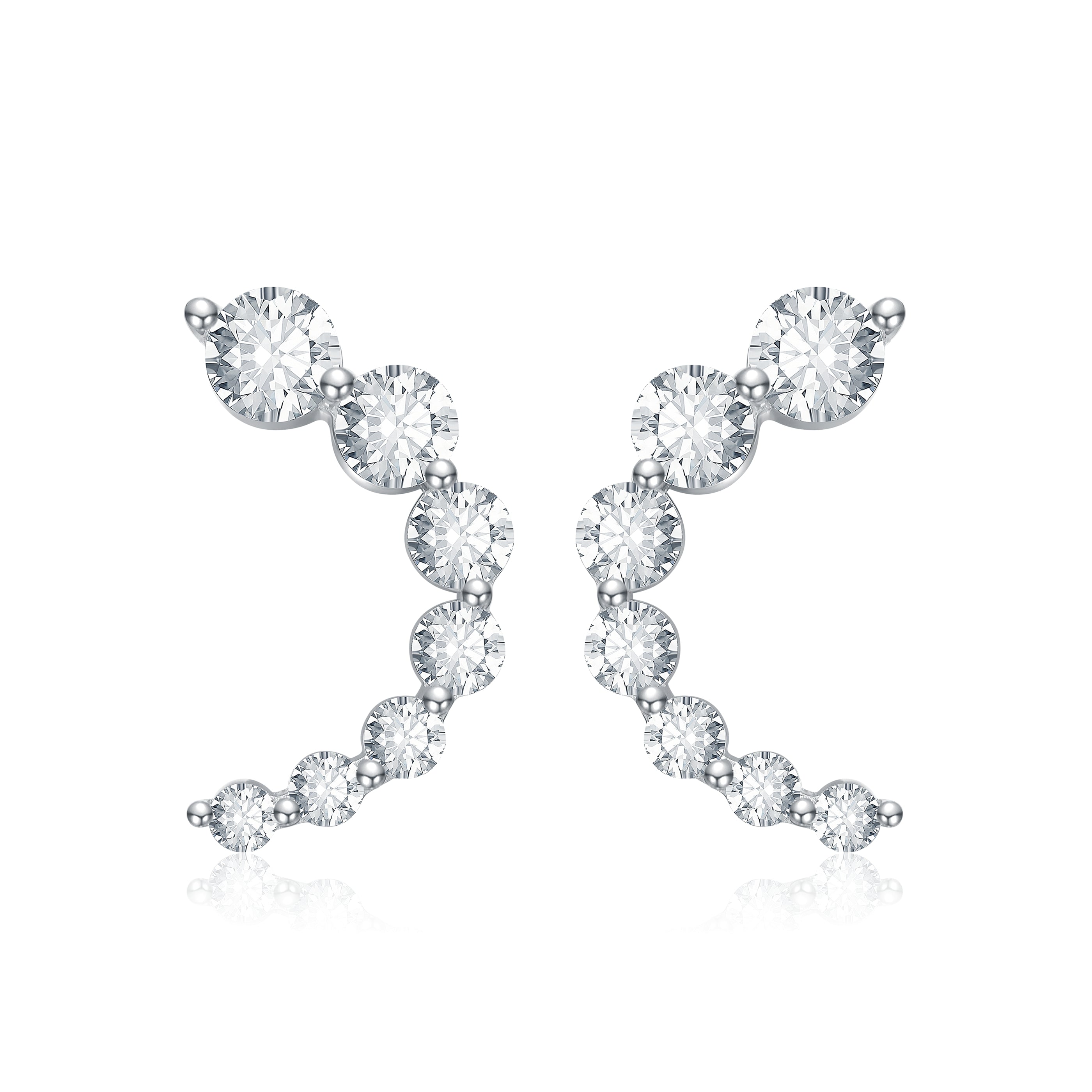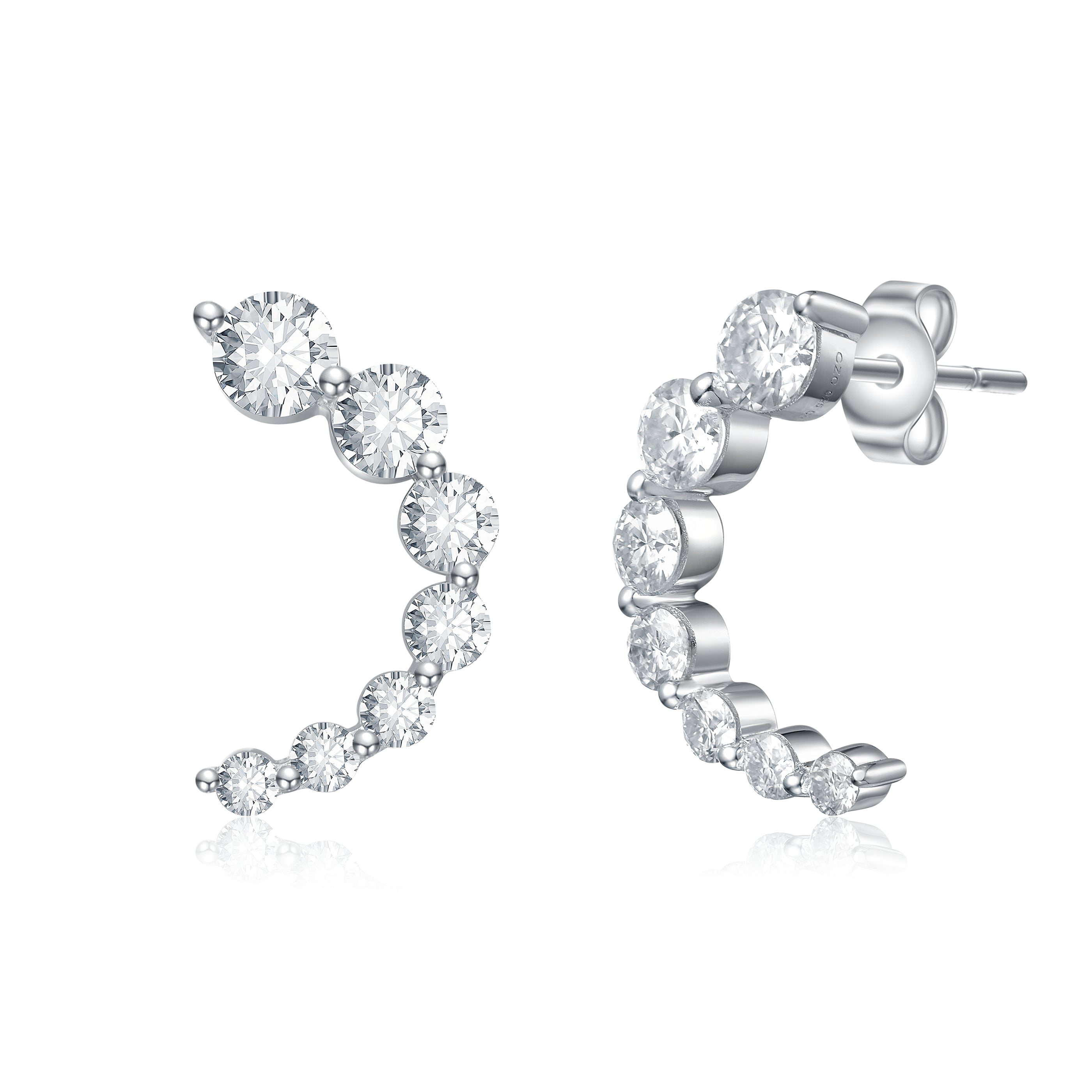 Sterling Silver White Gold Plated with 0.96ct Lab Created Moissanite Open Cuff Half-Hoop Earrings. Add the perfect finishing touch to your day, night, or workwear with these petite open cuff earrings, featuring a half-hoop shape. Sparkling round brilliant cut lab created moissanite secured in an eternity shared prong setting adds fire and prestige to any look as they glisten from all angles when worn, totaling 0.96ct. Butterfly backs keep these petite earrings secure, all crafted in brightly polished sterling silver white gold plating.