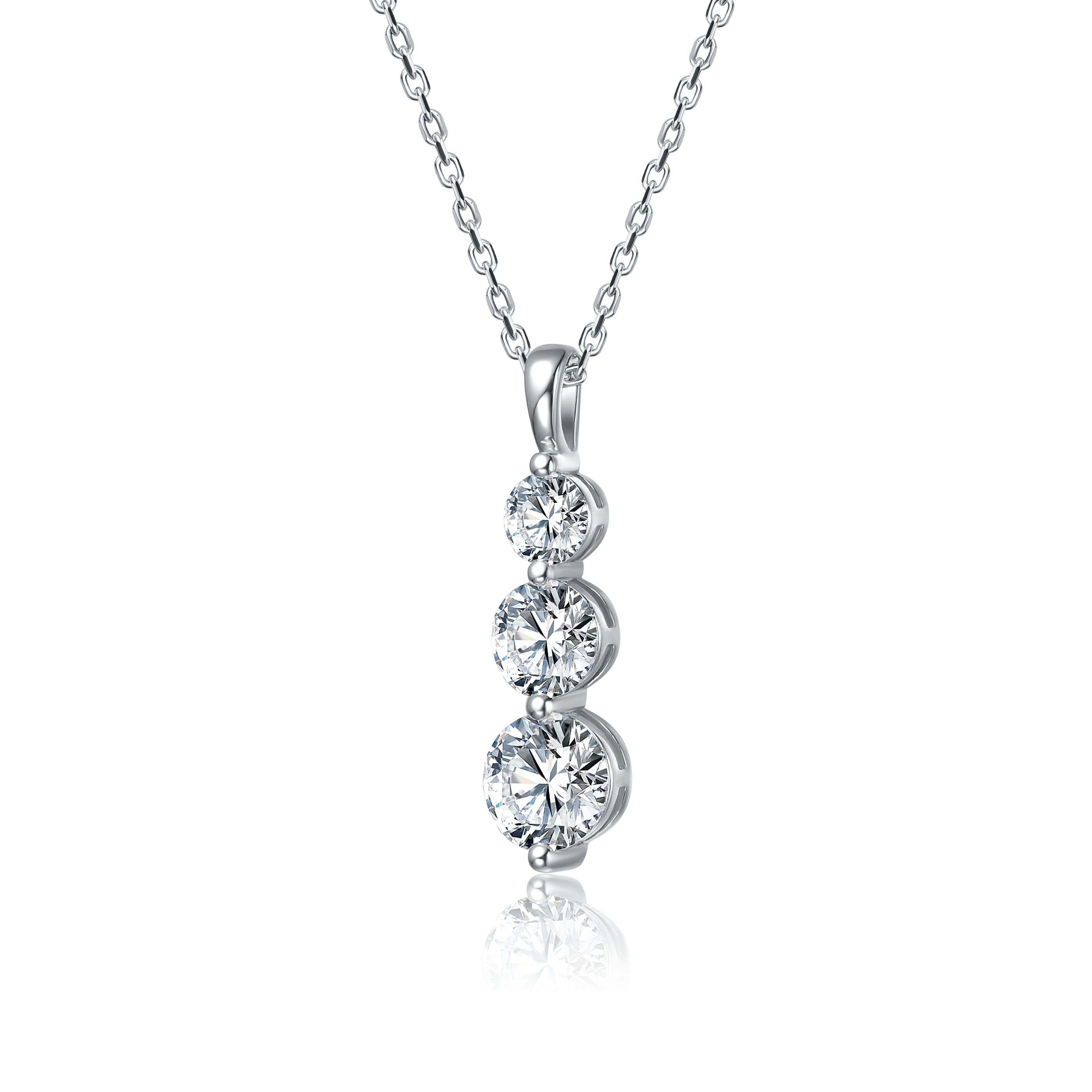 Sterling Silver White Gold Plated with 1.50ct Lab Created Moissanite Three-Stone Anniversary Necklace. Sterling Silver White Gold Plated with 1.50ct Lab Created Moissanite Three-Stone Anniversary Necklace. Gift this classic design to your loved one, featuring a sparkling three-stone round brilliant cut lab created moissanite drop pendant, representing the most cherished times in a past, present, and future setting, all totaling 1.50ct. A delicate 18-inch long cable chain threaded through the top bail makes this necklace ready for wear, secured with a lobster clasp for your convenience. Designed in sterling silver white gold plating for added luxury and durability.