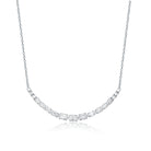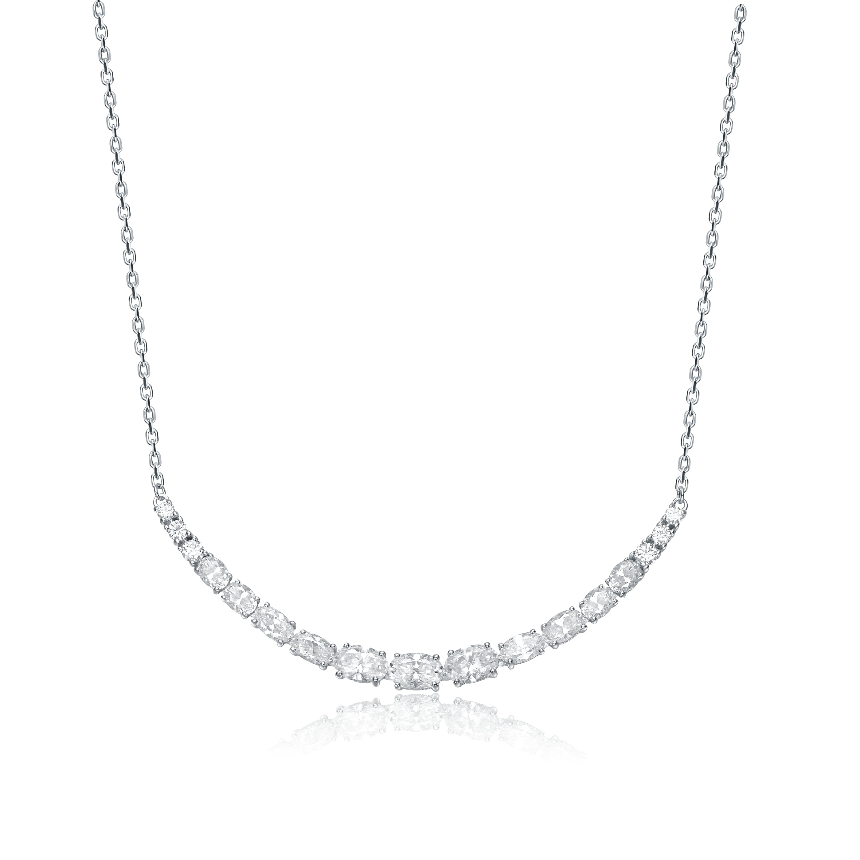 Sterling Silver White Gold Plated with 1.96ct Lab Created Moissanite Curved Bar Necklace. Fuse modern style with timeless elegance by wearing this versatile sterling silver white gold plated necklace, featuring a curved bar pendant glittering with round brilliant cut and oval cut lab created moissanite secured in prong settings, totaling 1.96ct. An 18 inch-long cable chain secured with a lobster clasp makes this pretty necklace easy to wear, taking your look to another level of glamor, perfect for any time.