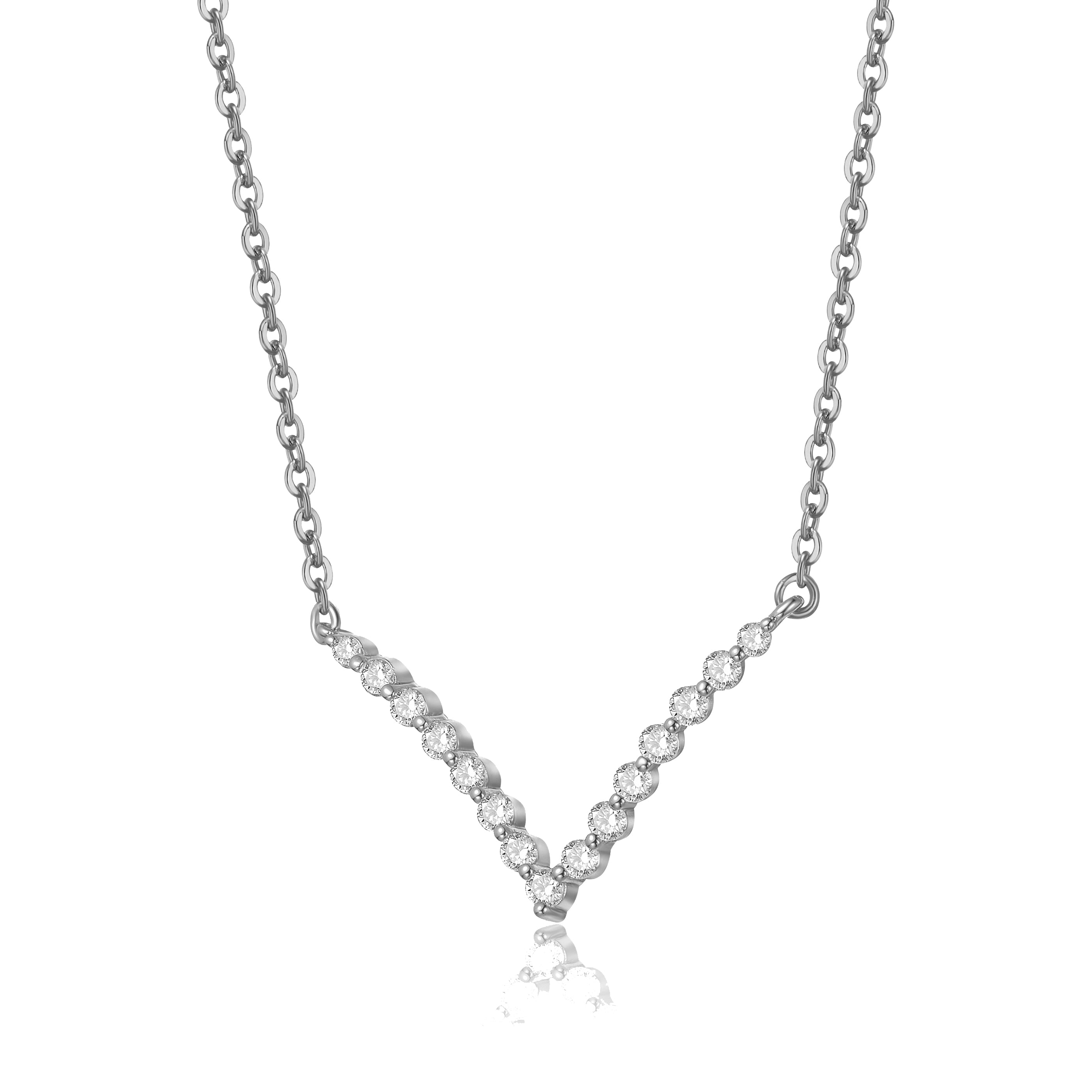 This striking chevron necklace features graduated lab created moissanite stones arranged in a refined V-shape that flatters the neckline beautifully. Crafted in white gold plated sterling silver, the design balances bold sparkle with elegant structure, making it ideal for both statement wear and elevated everyday styling.