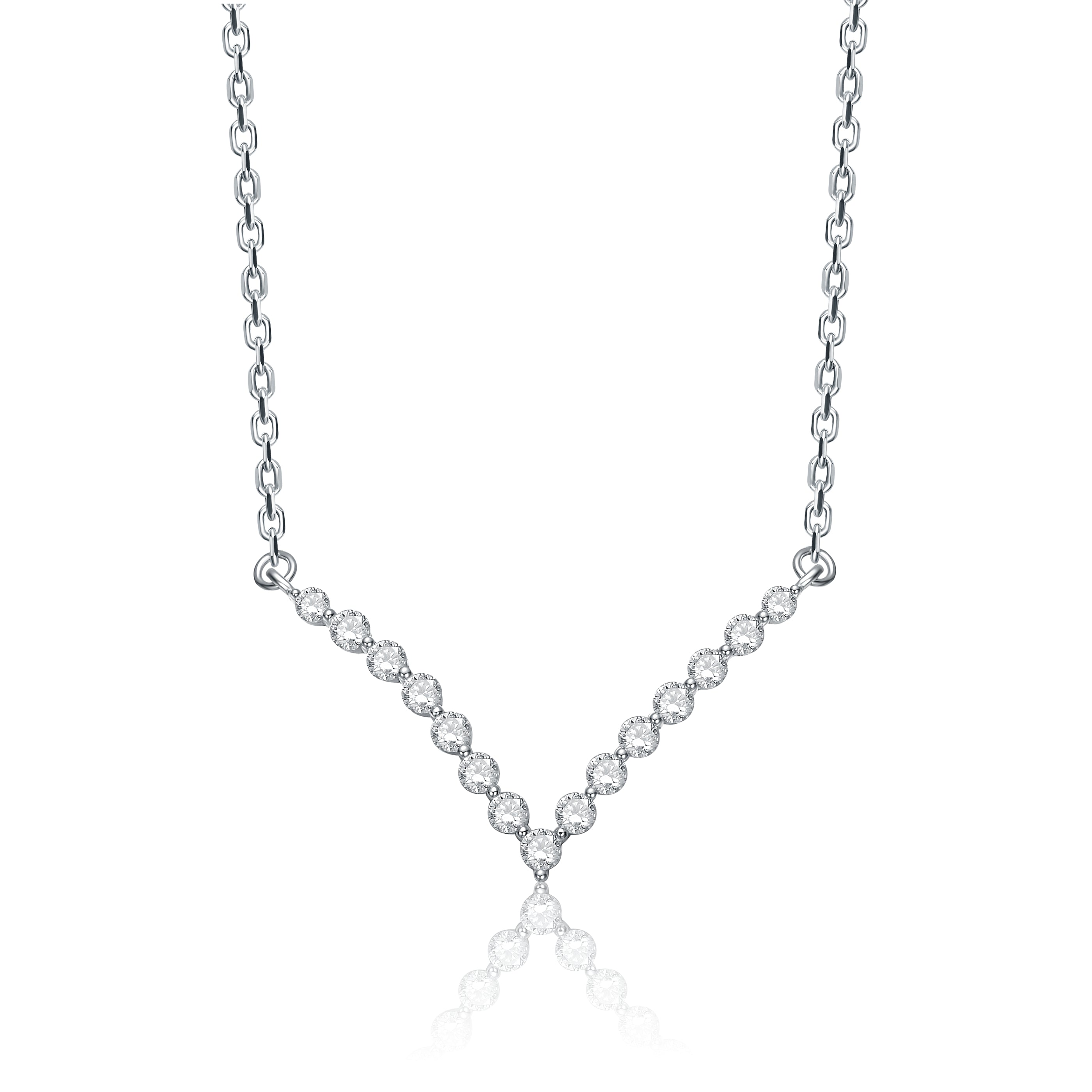 Sterling Silver White Gold Plated with 2.15ct Lab Created Moissanite V-Shaped Chevron Necklace. Graduated-size round brilliant cut lab created moissanite stones nestle in shared prong settings on the front of this sterling silver white gold plated necklace, giving it a stunning v-shaped chevron style with a total weight of 2.15ct. A delicate cable chain keeps it secure, measuring 18 inches long with an extension chain and secure lobster clasp for added stylistic versatility. Gift this pretty necklace to any loved one for a holiday, anniversary, or birthday, or indulge in contemporary elegance.