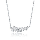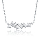 Sterling Silver White Gold Plated with Lab Created Moissanite Cluster Cascade Necklace. A gorgeous cascade of mixed-cut princess, baguette, and round brilliant cut lab created moissanite secured in classic prong settings forms a stunning single cluster row, giving this necklace a boost of holiday cheer that is also perfect for year-round wear. A delicate 18-inch long cable chain secured with a lobster clasp keeps this sterling silver white gold plated necklace in place, elevating your look to another level of glamor with effortless style.