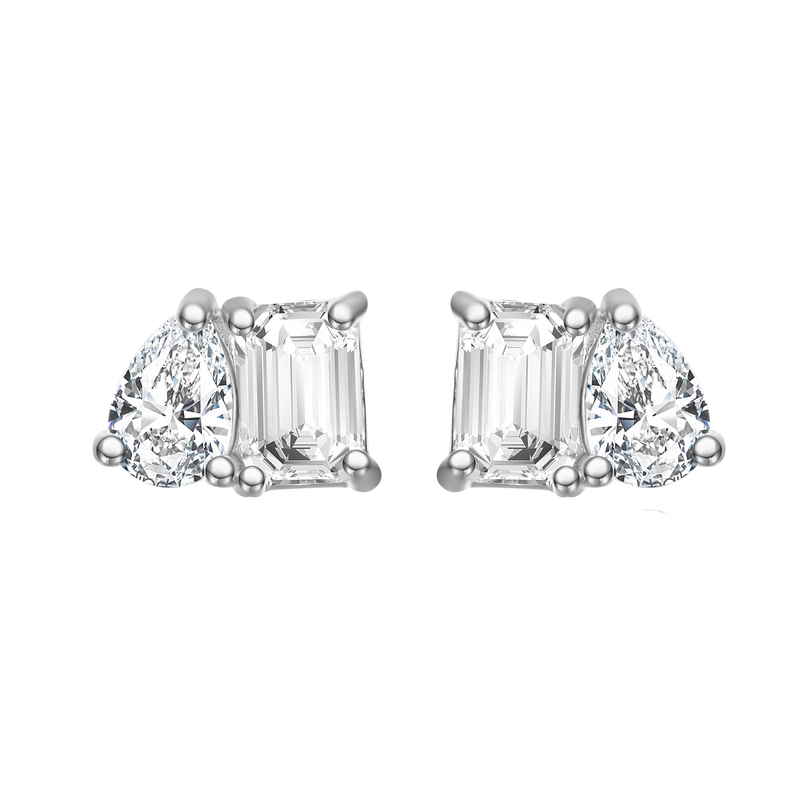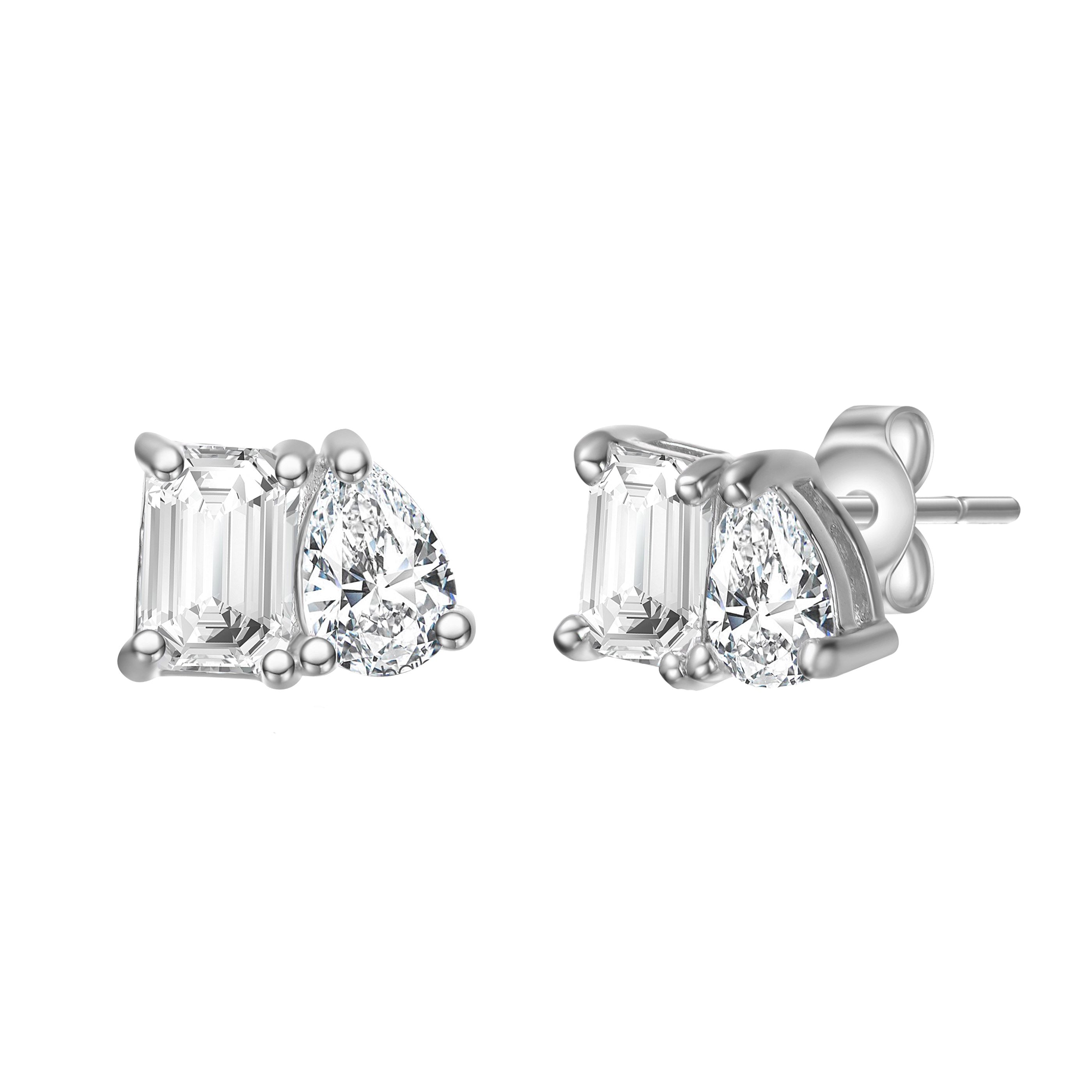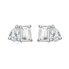 Sterling Silver White Gold Plated with Lab Created Moissanite Toi et Moi Stud Earrings. Exude elegance and modern glamor with these brightly polished sterling silver white gold plated stud earrings. Emerald cut and pear-shaped lab created moissanite secured in prong settings give these glamorous earrings a Toi et Moi two-stone design, with each stone complementing the other with unique asymmetry and high shine, all with D-color quality. Post backs keep these cluster studs secure, creating the perfect touch to your anytime wardrobe with ease of wear and endless style.