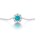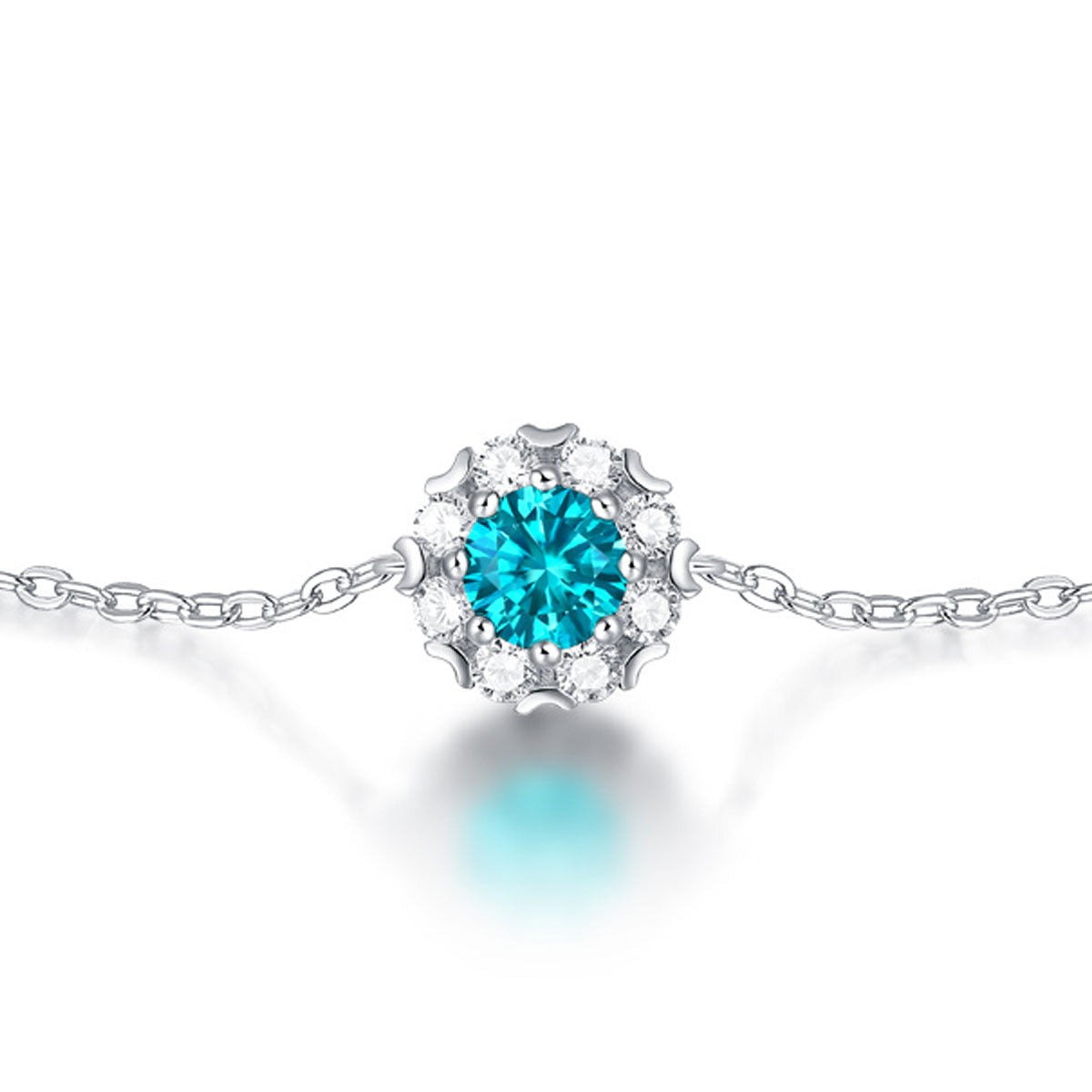 Sterling Silver with 0.50ctw Lab Created Moissanite & Blue Topaz Round Halo Adjustable Station Charm Bracelet. Make an elegant addition to your layering bracelet collection with this stunning sterling silver 0.50ctw bracelet featuring a round brilliant cut lab created moissanites prong set in a dazzling halo cluster with VVS1 clarity and D color. A blue topaz (December birthstone) nestled in the center adds a personalized touch to this sweet design. A delicate cable chain secures with a spring ring clasp and adjustable extension chain for versatile wear.