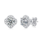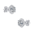 Sterling Silver with 0.50ctw Lab Created Moissanite Round Halo Floral Cluster Stud Earrings. These stunning sterling silver earrings feature 0.50ctw of round brilliant cut lab created moissanite stones prong set in solitaire and clusters, giving them a fancy floral shape with a hint of understated glamor. These moissanite stones have VVS1 clarity and D color. Butterfly backs keep these stud earrings secure, making them perfect for frequent wear. Add a luxurious touch to your day, night, or casual attire.