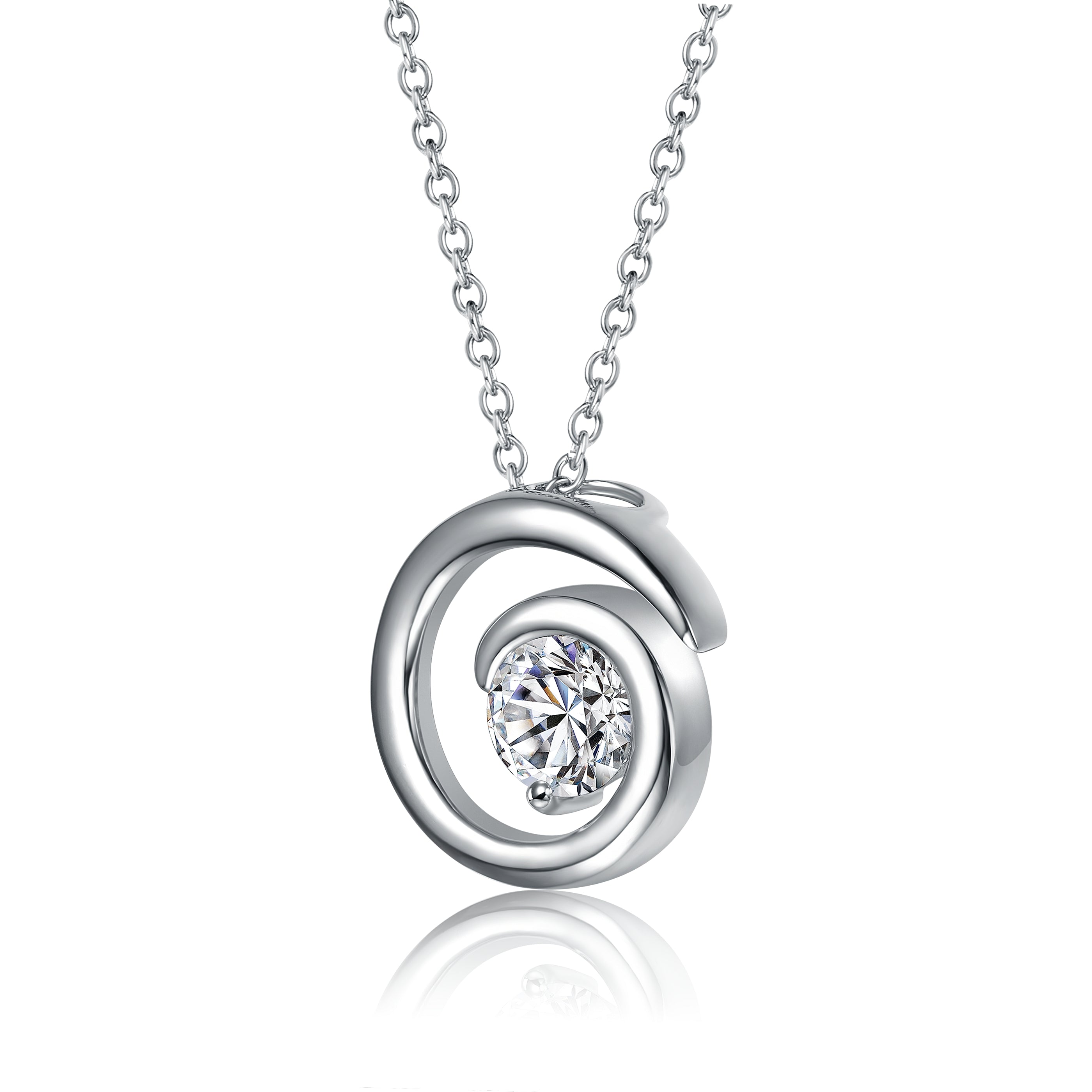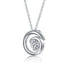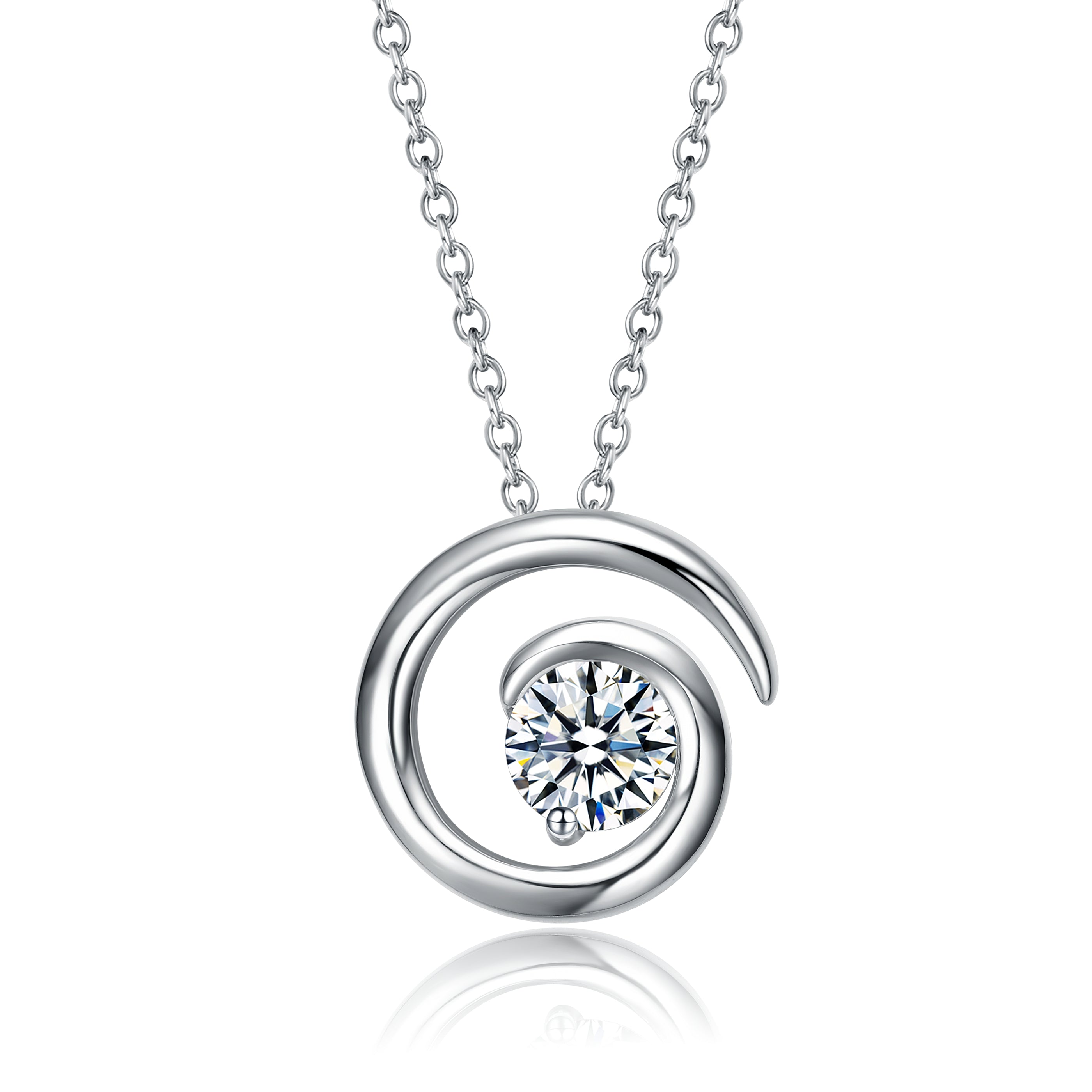 Sterling Silver with 1ct Lab Created Moissanite Open Eternity Circle Swirl Pendant Necklace. This unique brightly polished sterling silver necklace features a 1ct round brilliant cut lab created moissanite prong set in an open swirling eternity circle and has VVS1 clarity and D color. This enchanting pendant suspends from a rope chain with an invisible bail, giving it the illusion it is floating when worn. A lobster clasp keeps it secure, making it versatile and easy to mix and match.