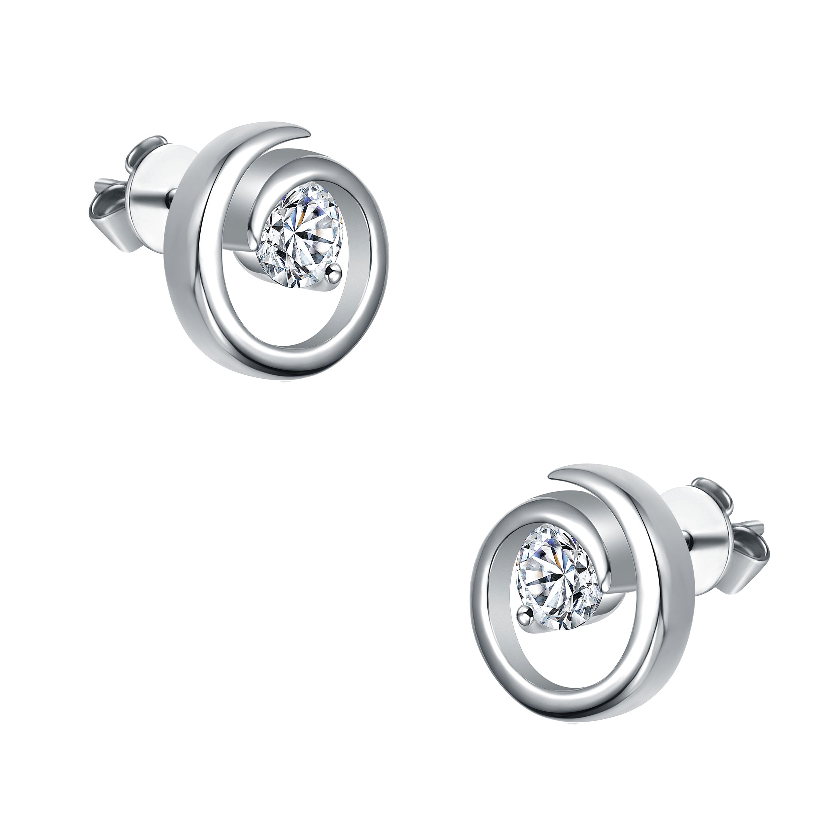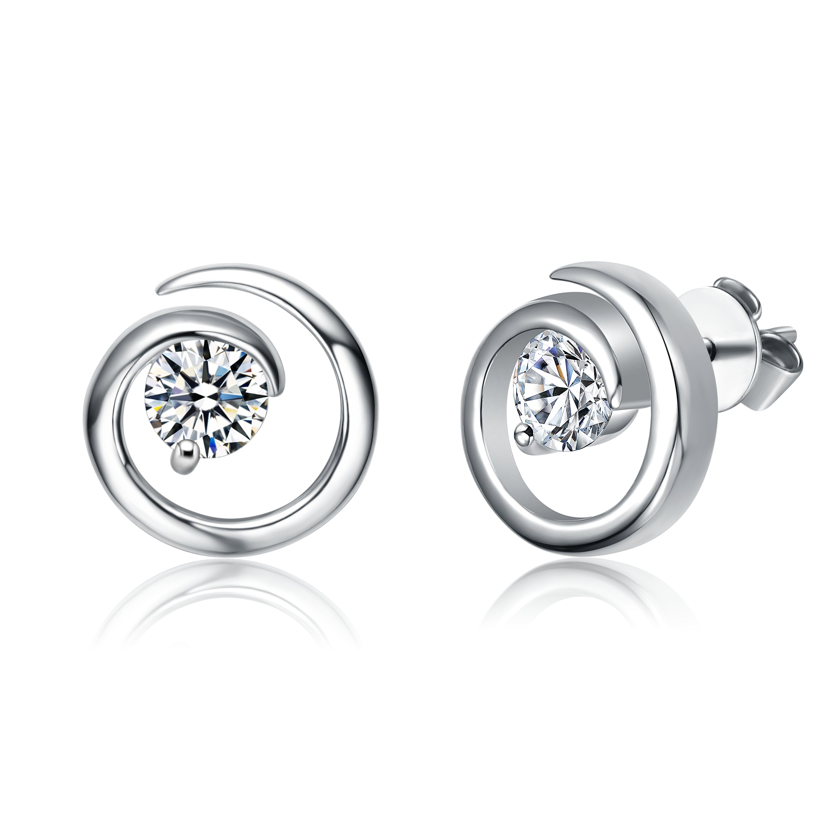 Sterling Silver with 1ct Lab Created Moissanite Open Eternity Circle Swirl Stud Earrings. Add luxury to your day, night, or work wardrobe with these stunning sterling silver earrings featuring 1ct of round brilliant cut lab created moissanites in prong settings and have VVS1 clarity and D color. Open swirling eternity circles offer a unique dimension and contemporary elegance, all in a rich shine. Gift these earrings to any loved one, or treat yourself to something divine.