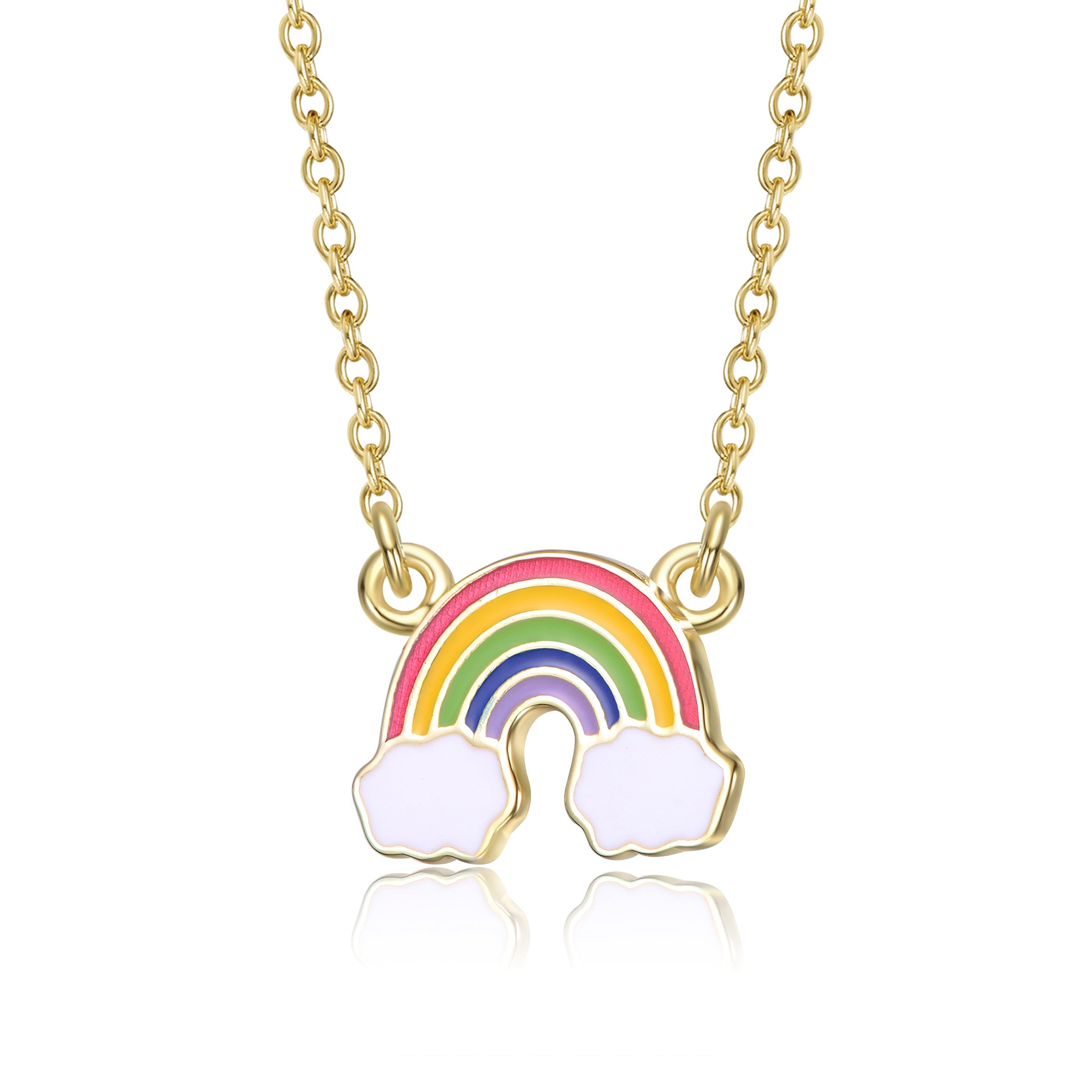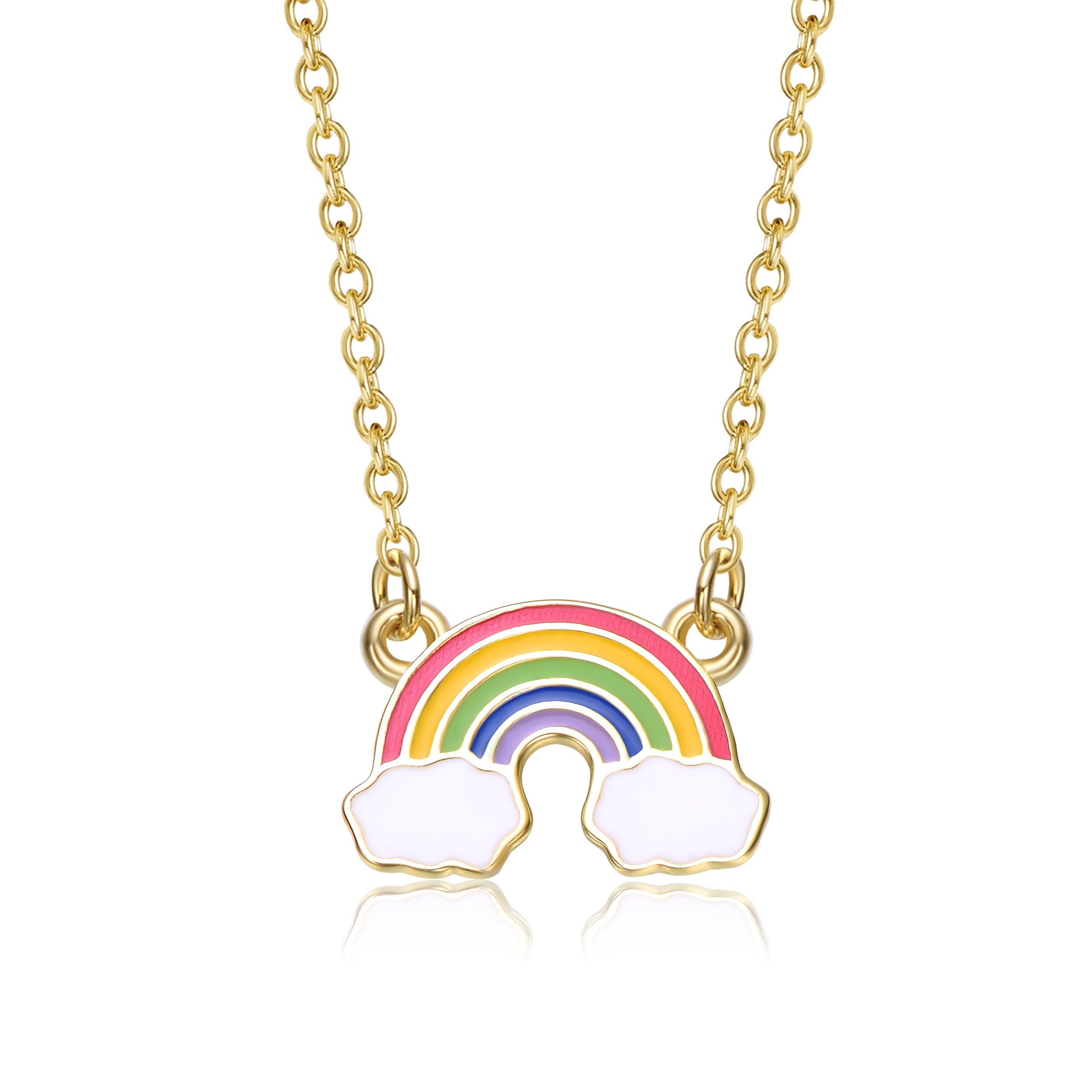 Sterling Silver 14k Gold Plated Rainbow Enamel & Cloud Pendant Necklace. This joyful necklace features a colorful rainbow and bright white clouds, all designed in a rich, high-quality enamel, adding cheerfulness to your kids day or night wardrobe. There is also happiness and abundance of hope and laughs at the end of every rainbow!