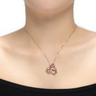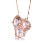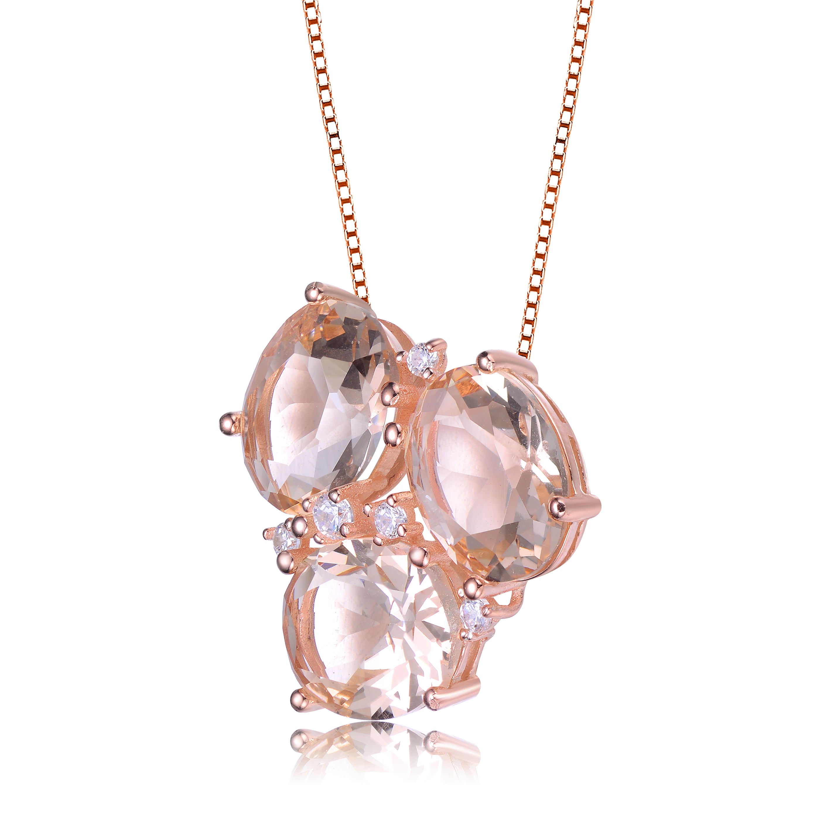 Unique 3-stones morganite cubic zirconia with accent of small clear gemstones. This pendant necklace is made from .925 sterling silver plated with rose gold comes with cable chain and secured by spring ring.