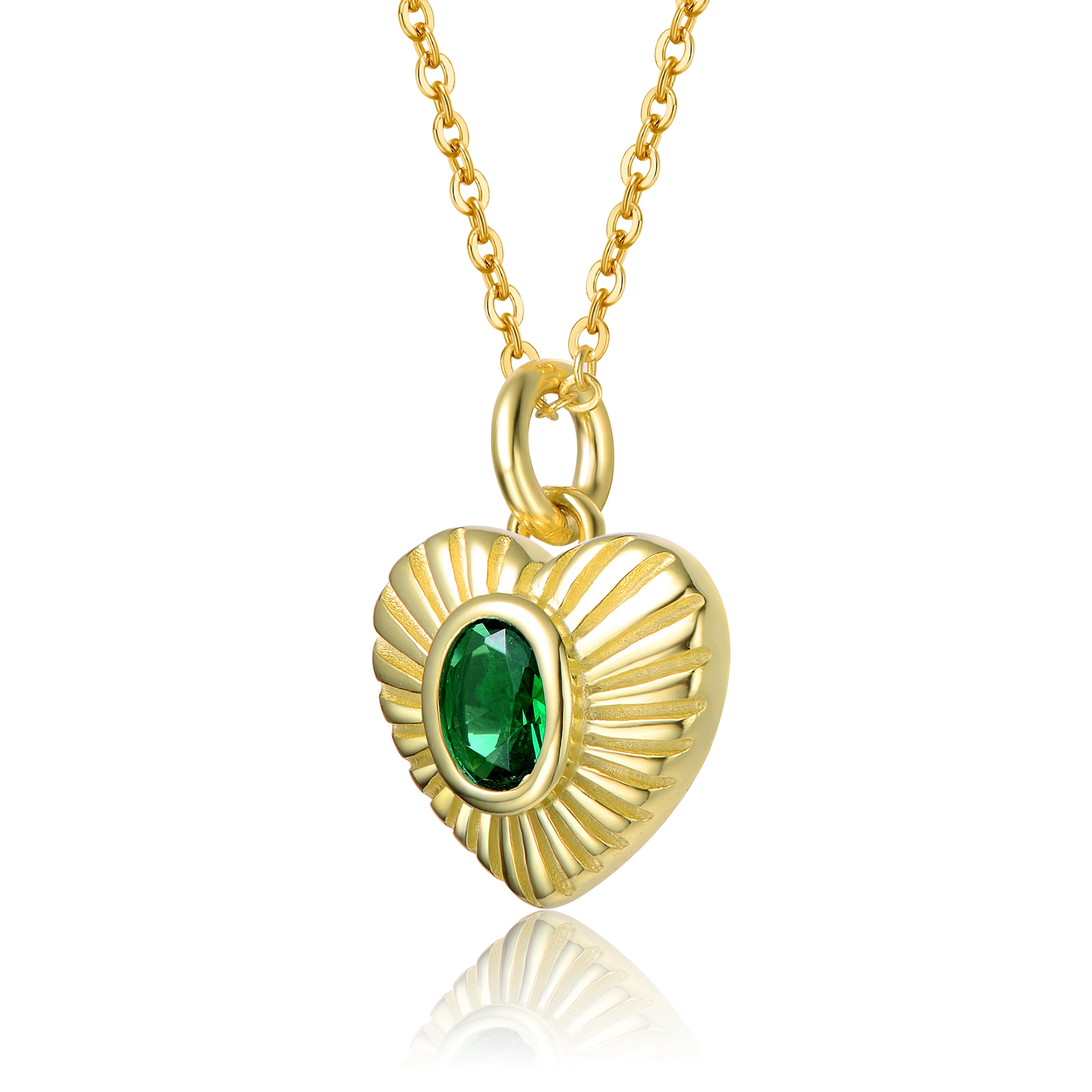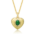 Sterling Silver 14k Yellow Gold Plated with Emerald Cubic Zirconia Sunray Heart Stud Pendant Necklace. Add another level of enchantment to your day, night, or workwear with this fashionable stud Pendant Necklace, finely crafted in sterling silver 14k yellow gold plating. Oval cut rich green emeraldcubic zirconias bezel set in the middle complement the textured sunrays on each heart stud. This Pendant Necklace secures with a spring ring.