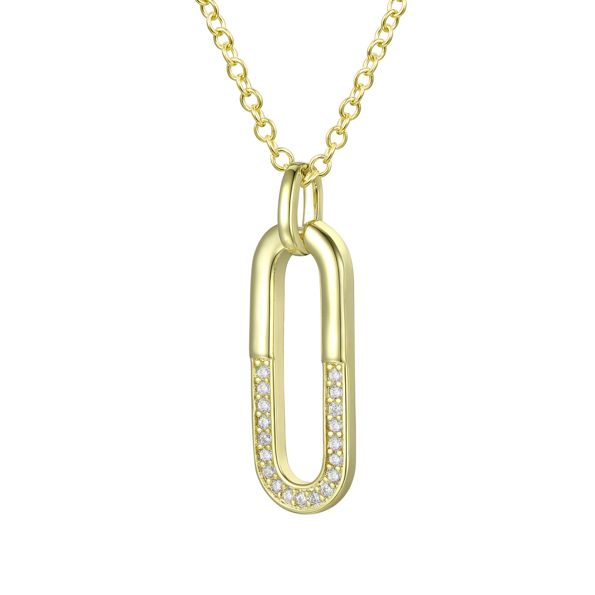 Elegant 14K Gold Plated Cubic Zirconia Geometrical Pendant Necklace. This item features design made out of curved rectangle, half made out of solid metal, half accented with clear round cubic zirconia stones. Crafted with 14K Gold Plating and secure with spring ring closure. It's a unique piece of jewelry for all combinations. These also make a sensational gift for a special birthday or occasion. Also Available in white.