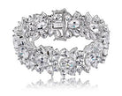 This elegant wide cuff bracelet is decorated with dazzling round and pear-cut cubic zirconia stones. Crafted of .925 sterling silver, the bracelet secures with a box clasp.