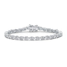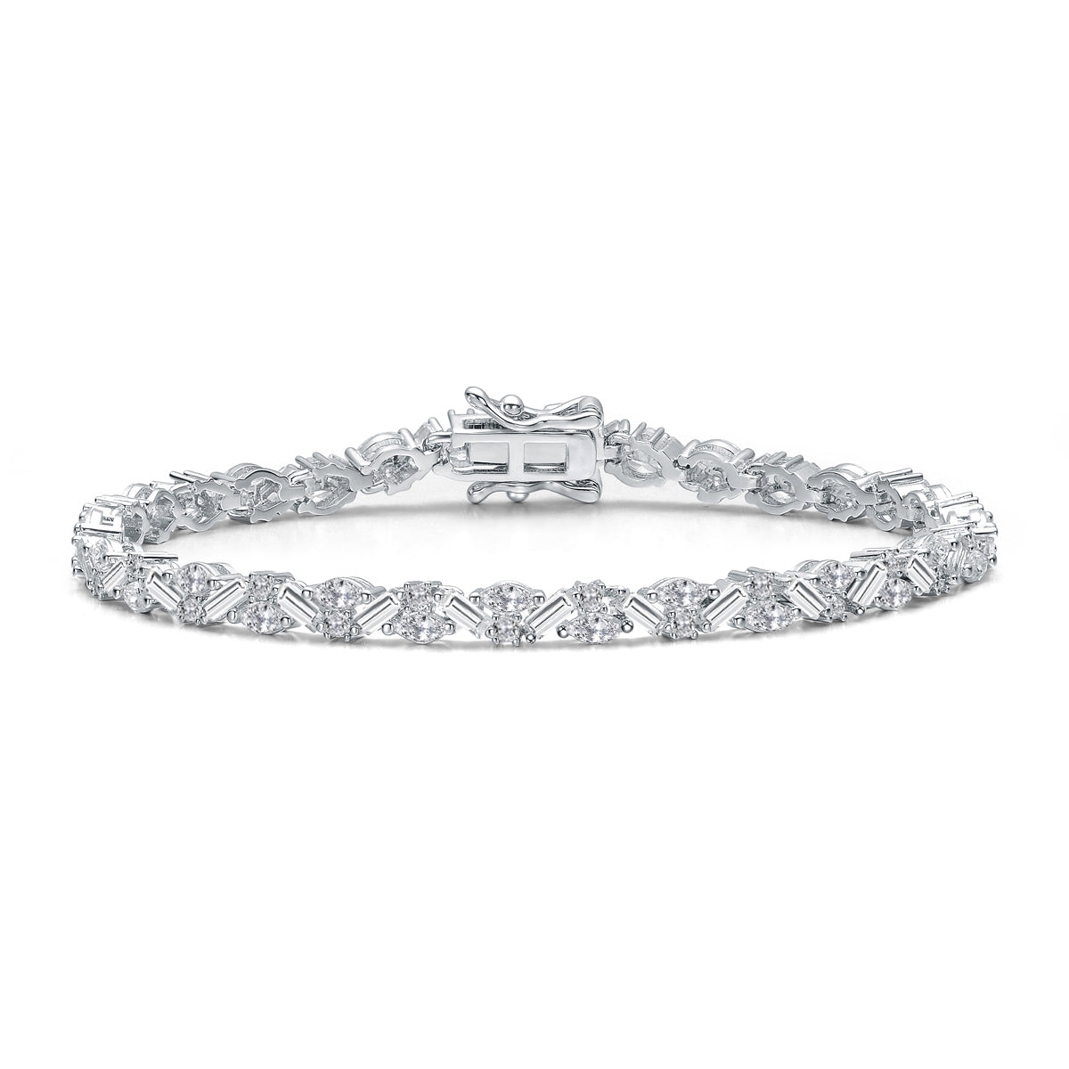 Sterling Silver White Gold Plated with Clear Cubic Zirconia Statement Bracelet. This beautiful bracelet radiates elegance with its sterling silver foundation, plated in white gold for a luminous finish. Each link is meticulously crafted and encrusted with a shimmering mosaic of clear cubic zirconia stones in a variety of dazzling shapes—including round, marquise & tapered baguette cubic zirconia—creating captivating brilliance from every angle. A secure box clasp with a safety latch ensures comfort and confidence. Whether you're dressing for an evening affair or elevating everyday glam, this statement piece brings refined sparkle to any occasion.