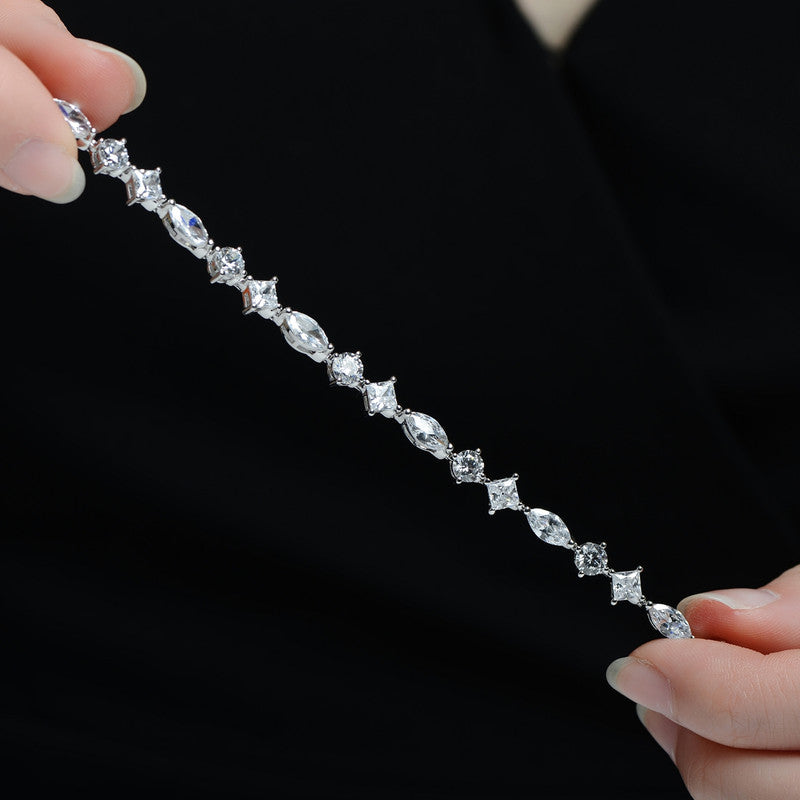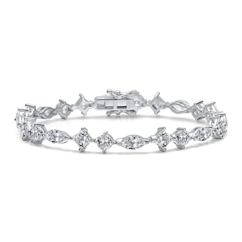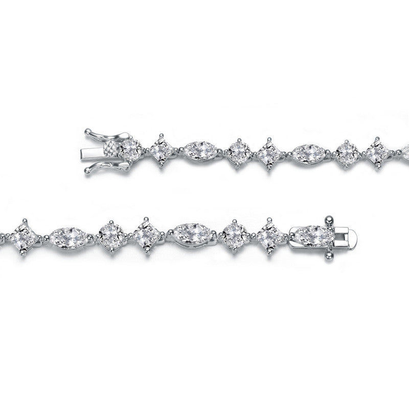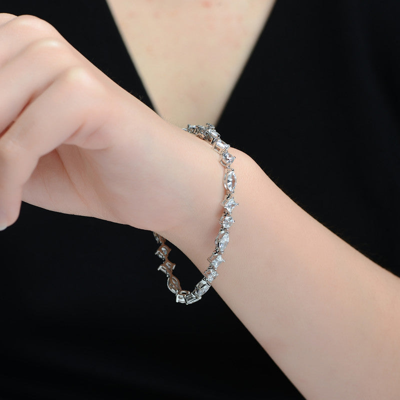 Gracefully designed to captivate, this statement bracelet features a refined sequence of brilliantly set cubic zirconia stones arranged in a harmonious blend of classic shapes. The balanced, symmetrical layout creates a polished silhouette that sparkles with timeless elegance, while the luminous white gold finish enhances its sophisticated appeal. Perfect for elevating special occasions or adding a touch of glamour to everyday style, this bracelet delivers enduring beauty with a modern, luxurious edge.