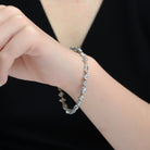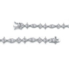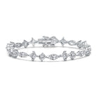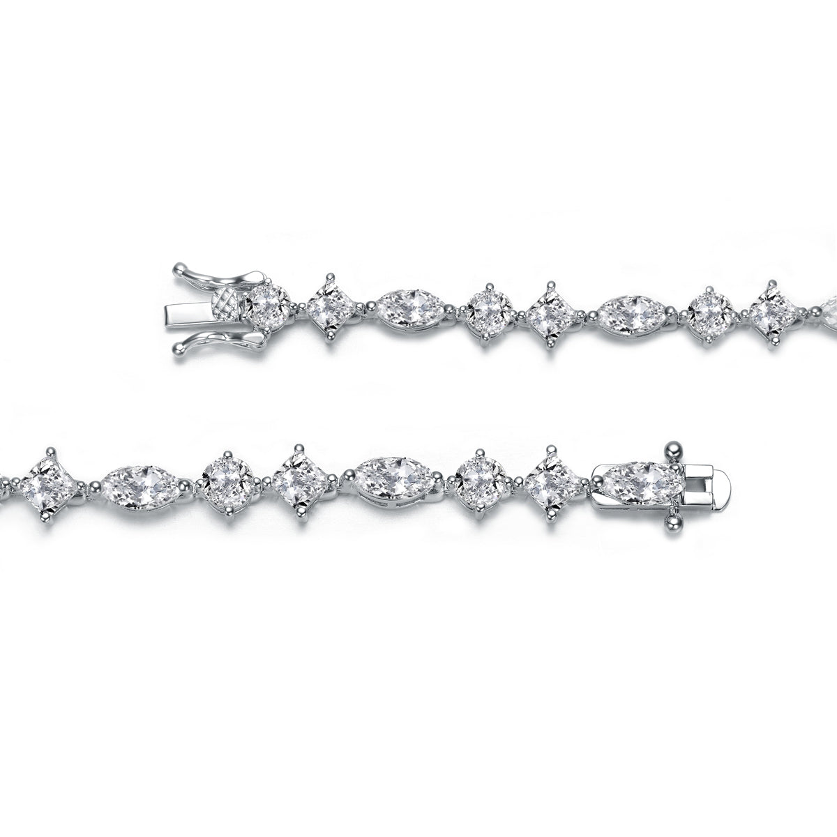 Sterling Silver White Gold Plated with Clear Cubic Zirconia Statement Bracelet. This beautiful bracelet radiates elegance with its intricate arrangement of clear cubic zirconia stones. Enhanced by lustrous white gold plating, it features a captivating sequence of round, marquise & square cubic zirconia, each securely nestled in prong settings. The alternating shapes create a harmonious, symmetrical design that gleams with refined sophistication. A secure box clasp with safety catches offers confident wear. Ideal for special occasions or adding a touch of everyday glamour, this bracelet fuses timeless sparkle with graceful charm.