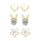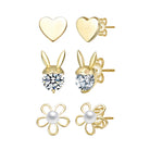 Elevate your everyday look with this charming 3-piece stud earring set designed to blend elegance and playful detail. The polished heart studs offer timeless simplicity, while the rabbit design sparkles with a delicate clear cubic zirconia accent for subtle brilliance. Completing the trio, the flower studs feature a luminous mother of pearl center that adds soft radiance and refined contrast. Finished in warm 14K yellow gold plating, each piece delivers a smooth, polished shine that complements any style. Wear them individually for a minimalist touch or mix and match to create a curated ear look that feels both sweet and sophisticated.