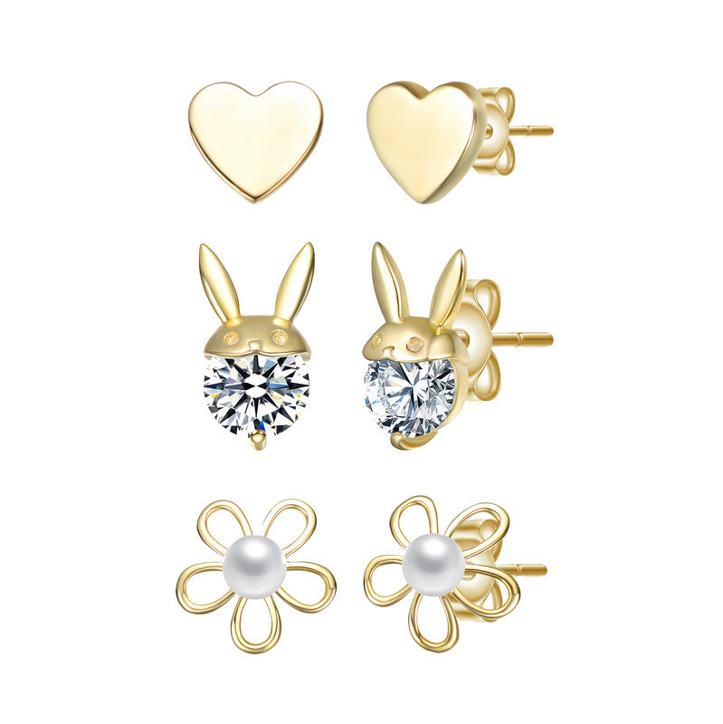 • 3-piece stud earring set: Rabbit, Heart & Flower designs