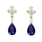Sterling Silver 14k Gold Plated Blue & White Cluster Dangle Earrings. These 14k gold plated sterling silver dangle earrings feature pear-shaped blue cubic zirconia secured in prong settings on the ends, giving these pretty earrings vibrancy and prestige. Mixed-cut white cubic zirconia prong set in a cluster on the top and middle creates a look of timeless elegance. Butterfly backs keep these glamorous earrings secure once placed on the ears, making them the perfect choice for those who love fire and color.