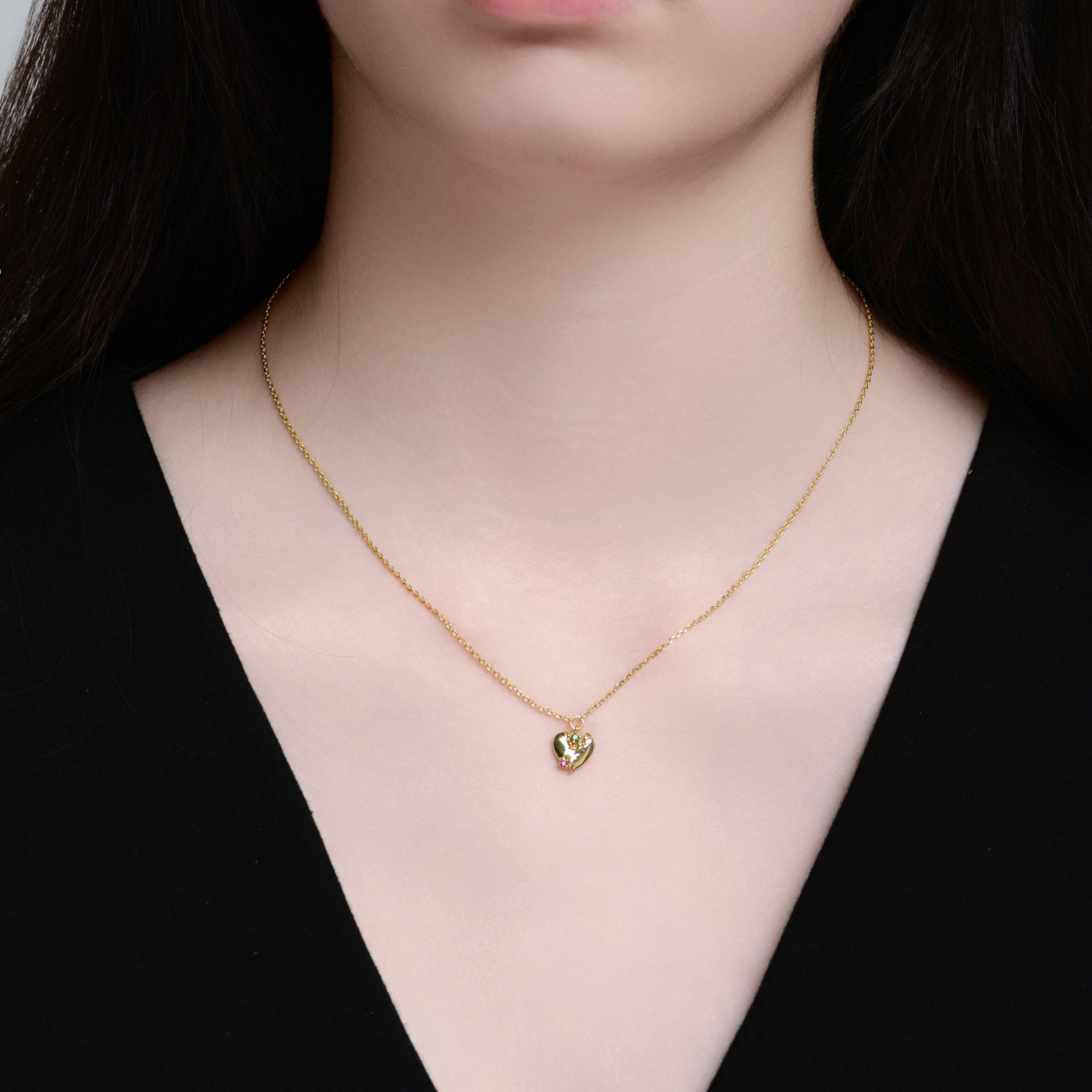 Sterling Silver 14K Gold Plated with Green & Red Cubic Zirconia Heart Design Necklace. Radiating warmth and charm, this heart-shaped necklace is crafted in sterling silver with a rich 14K gold plating. Two round-cut stones- a green Nano cubic zirconia and a red corundum-add a vibrant pop of color, symbolizing love and harmony. The delicate design makes it a graceful everyday piece or a heartfelt gift. Suspended from a fine chain, it blends elegance with sentiment, perfect for those who cherish meaningful style.