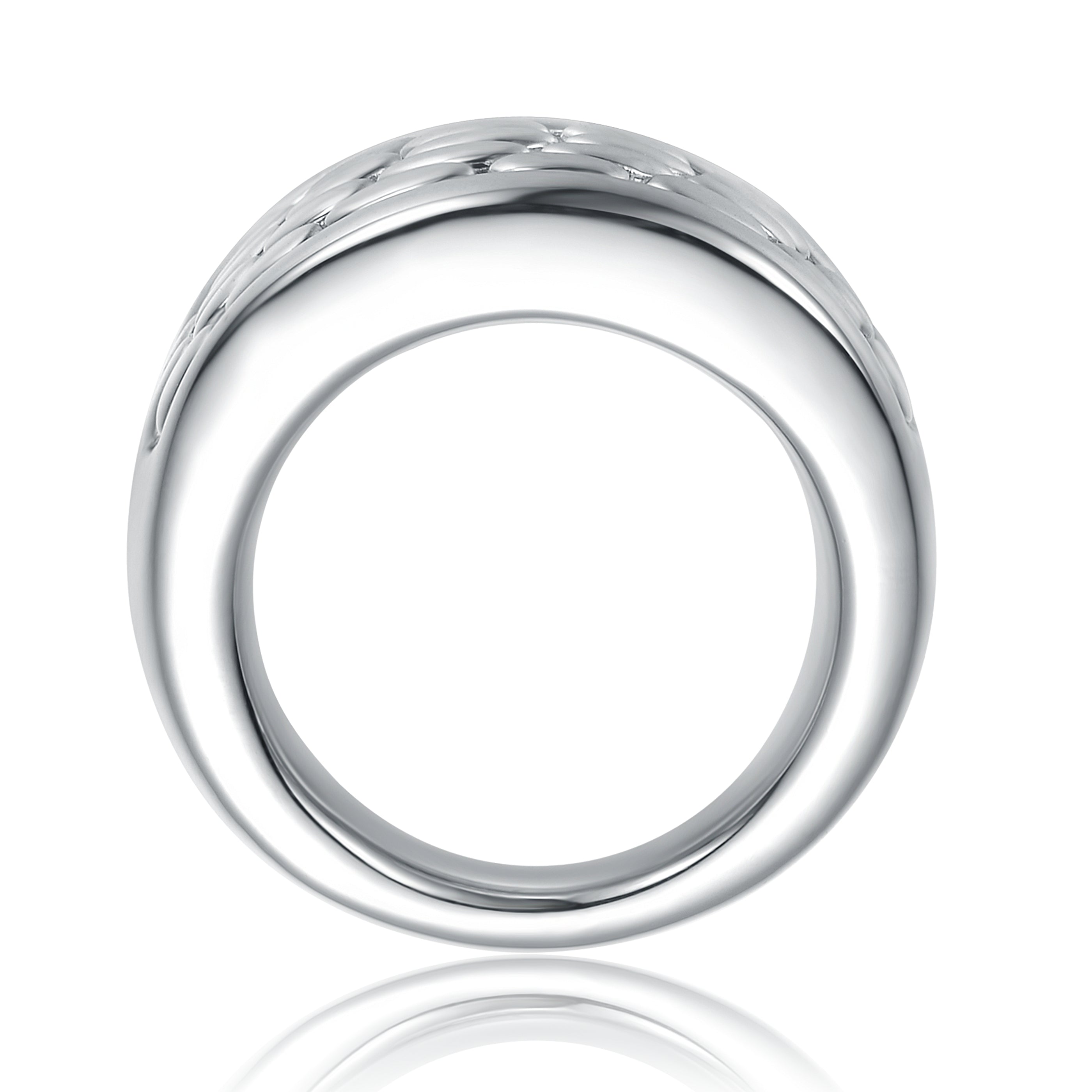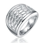 Sterling Silver Textured Pattern Ring. This beautiful White gold-plated textured Pattern Ring makes a bold statement. Its wide band showcases a captivating pebble-inspired design, crafted with raised oval elements that shimmer under light. The high-polish finish adds a sleek, modern edge, perfect for elevating everyday style or accenting evening wear. Available in sizes 6, 7, and 8, this ring blends artistry with elegance-ideal for those who love texture and shine in one stunning piece.