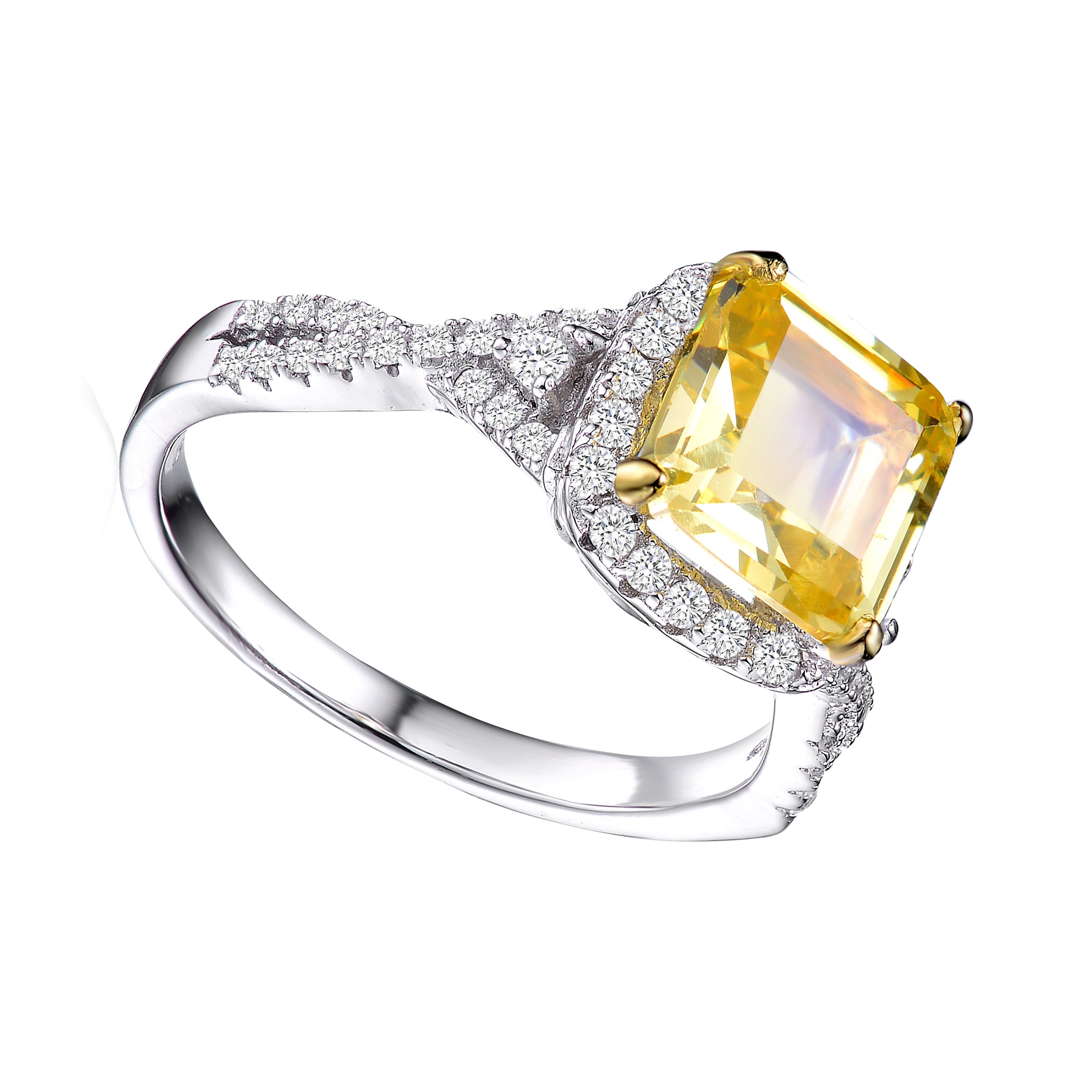 Sterling Silver with Rhodium Plated Yellow Cushion Cubic Zirconia with Clear Round Cubic Zirconias Accent Twisted Ring