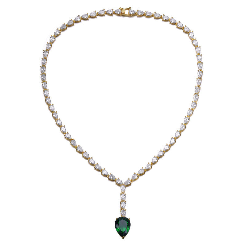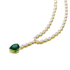 This elegant tennis necklace showcases a graceful row of shimmering clear cubic zirconia stones that create continuous brilliance around the neckline. At its center, a striking pear-shaped green cubic zirconia paired with clear accents forms a captivating focal point full of color and radiance. Crafted from sterling silver and luxuriously plated in 14K gold, it offers both durability and refined shine. The balanced silhouette blends classic tennis styling with a bold statement pendant for added sophistication. Perfect for formal occasions or elevating everyday attire, this necklace delivers timeless glamour with a modern touch.