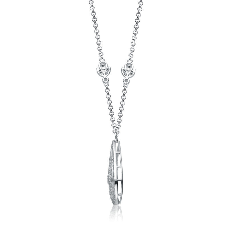 This beautifully crafted sterling silver necklace showcases an intricate teardrop-shaped pendant adorned with romantic heart details. At its center rests a brilliant white cubic zirconia gemstone, radiating sparkle from every angle. Surrounding heart accents enhance the symbolism of love while adding dimension and refined charm to the design. Delicate decorative elements along the chain provide an extra touch of elegance and craftsmanship. Perfect for everyday wear or meaningful occasions, this necklace blends timeless beauty with graceful sophistication.