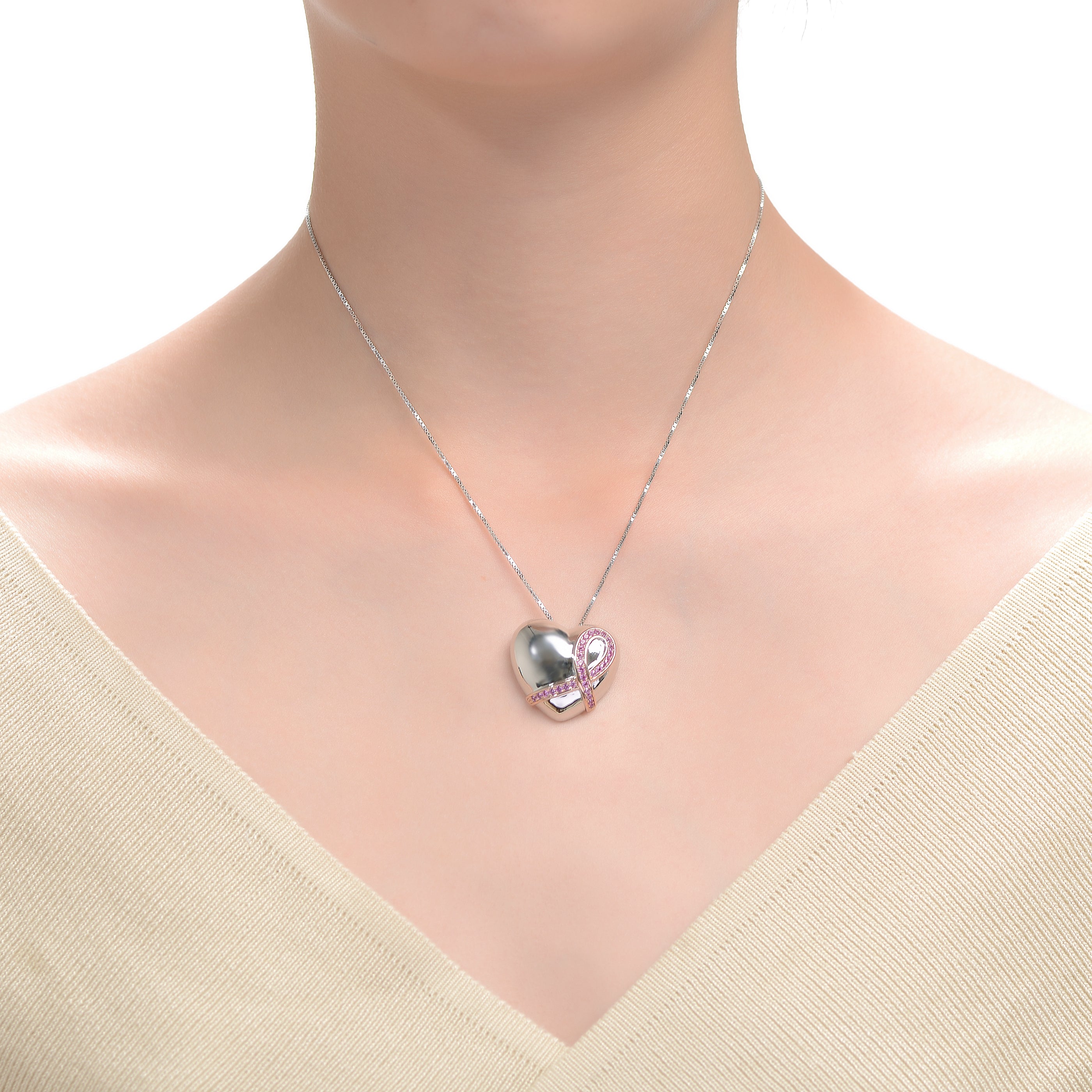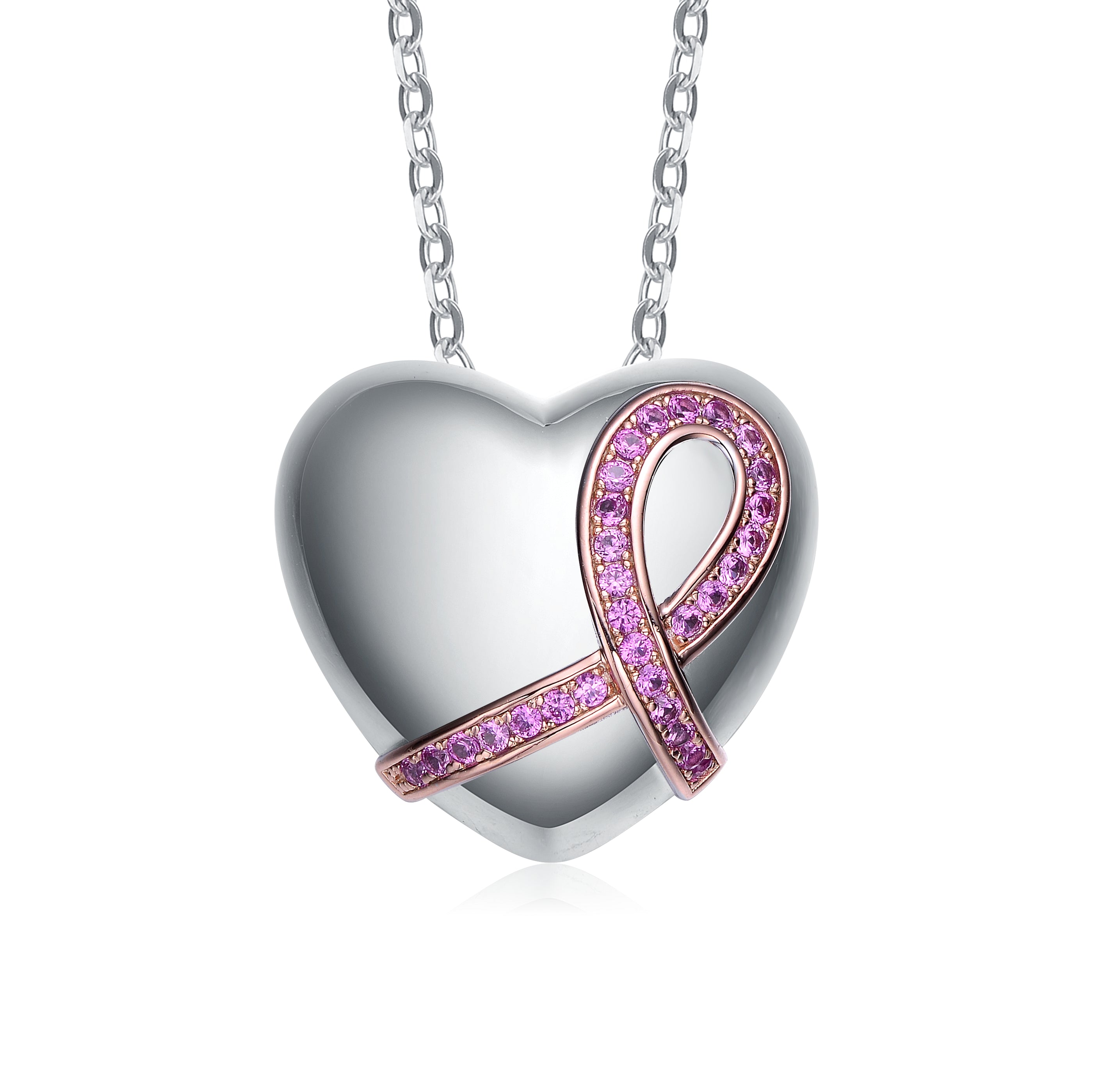 Stylish .925 Sterling silver with rhodium and rose gold plated and pink cubic zirconia heart necklace. The necklace is .925 Sterling silver with rhodium and rose gold plating and has a spring ring closure. Makes a great gift as well.