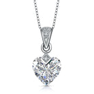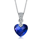 Striking and romantic, this sterling silver necklace features a bold heart-shaped cubic zirconia centerpiece that captures attention with its rich brilliance. The dramatic center stone is suspended from an ornate diamond-shaped connector, leading to a beautifully detailed clasp that adds an unexpected touch of artistry. Finished in sleek rhodium plating, this statement necklace blends elegance with distinctive design for a truly memorable look. Available in your choice of White, Sapphire, Ruby, Emerald, or Turquoise.