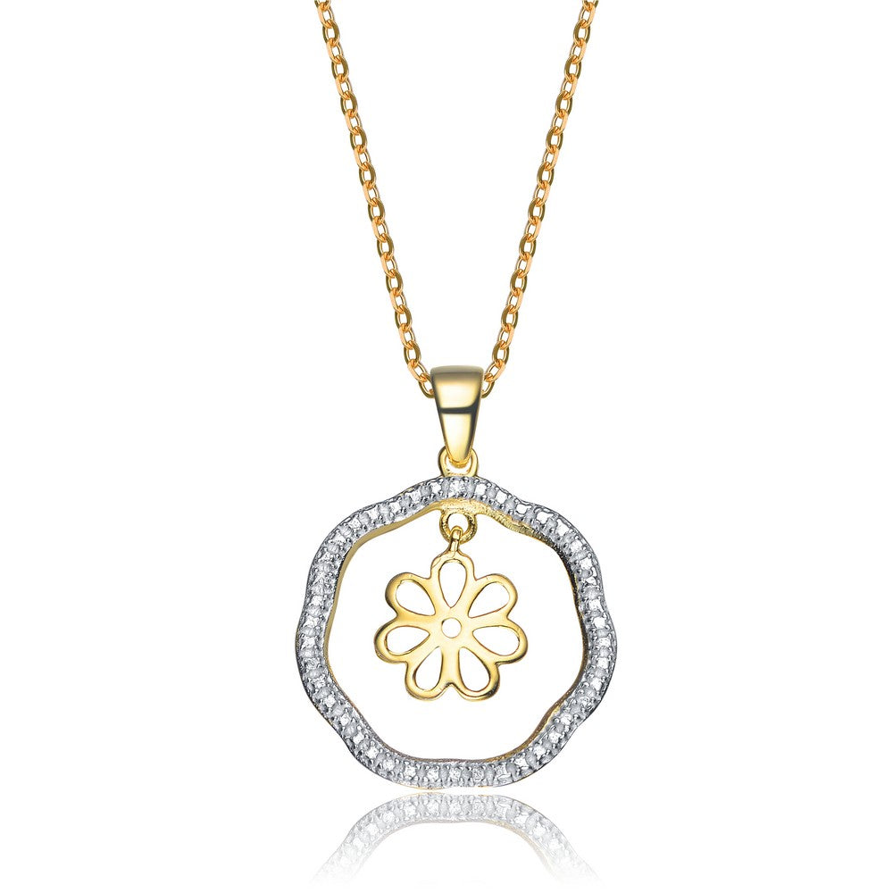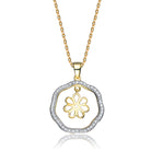 A wavy strand of cubic encrusted .925 Sterling silver circles about a gold plated center staged symmetrical flower with hollowed tear drop petals on this rolo chain golden hued matinee necklace.