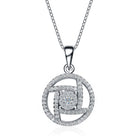 This circular pendant uses multiple white cubic in the outlines, with a large brilliant white cubic resting in the center. This sparkling pendant will work well with any ensemble and is great for everyday wear