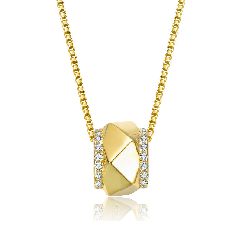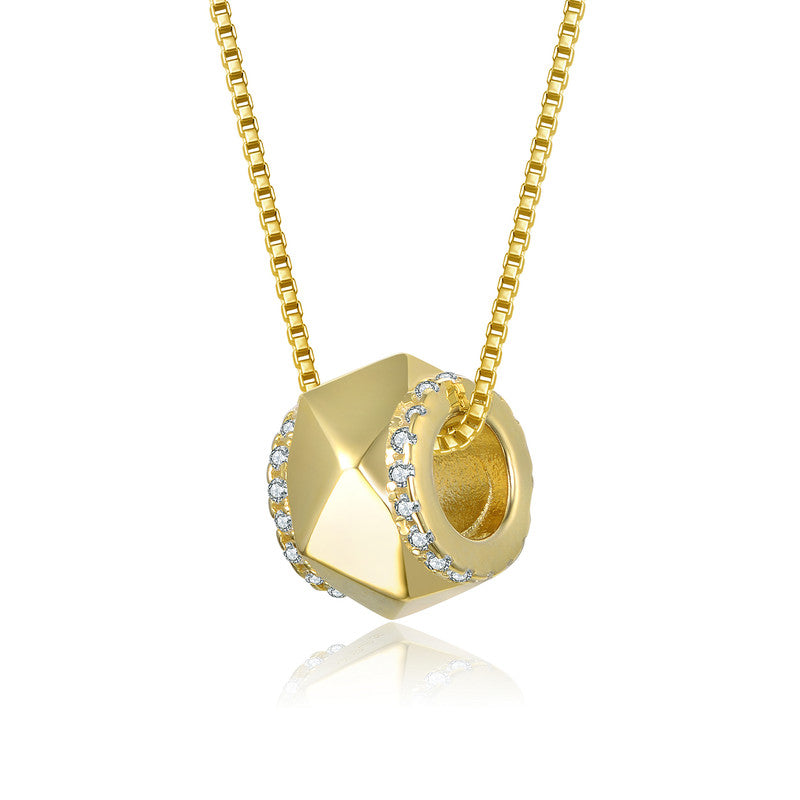 This modern geometric pendant necklace blends clean lines with brilliant sparkle. Crafted in sterling silver and plated in rich 14K gold, the faceted round silhouette is adorned with shimmering clear cubic zirconia that reflects light beautifully. Suspended from a refined chain, it delivers polished elegance with contemporary appeal. Perfect for layering or wearing alone, this piece adds effortless sophistication to any look.