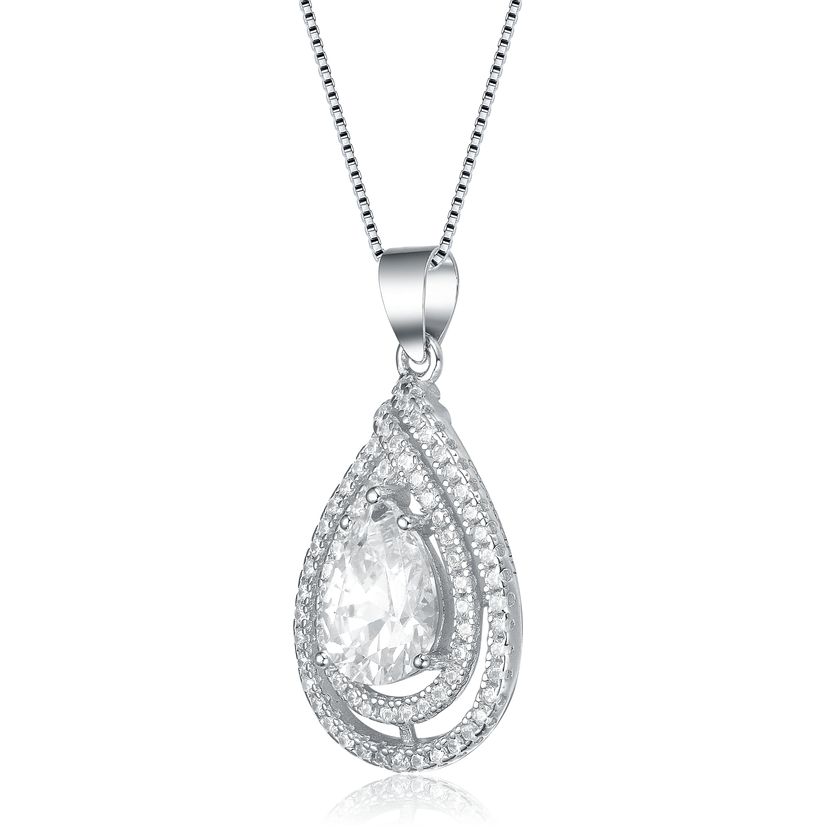 Delight your eyes with this shimmering piece. A pear cut center stone is surrounded by a halo of round cut cubic zirconia with a cross over at the top, all set in .925 Sterling silver.it comes with an 18 inch chain and has a spring ring closure.it comes with an 18 in. Chain and has a spring ring closure.