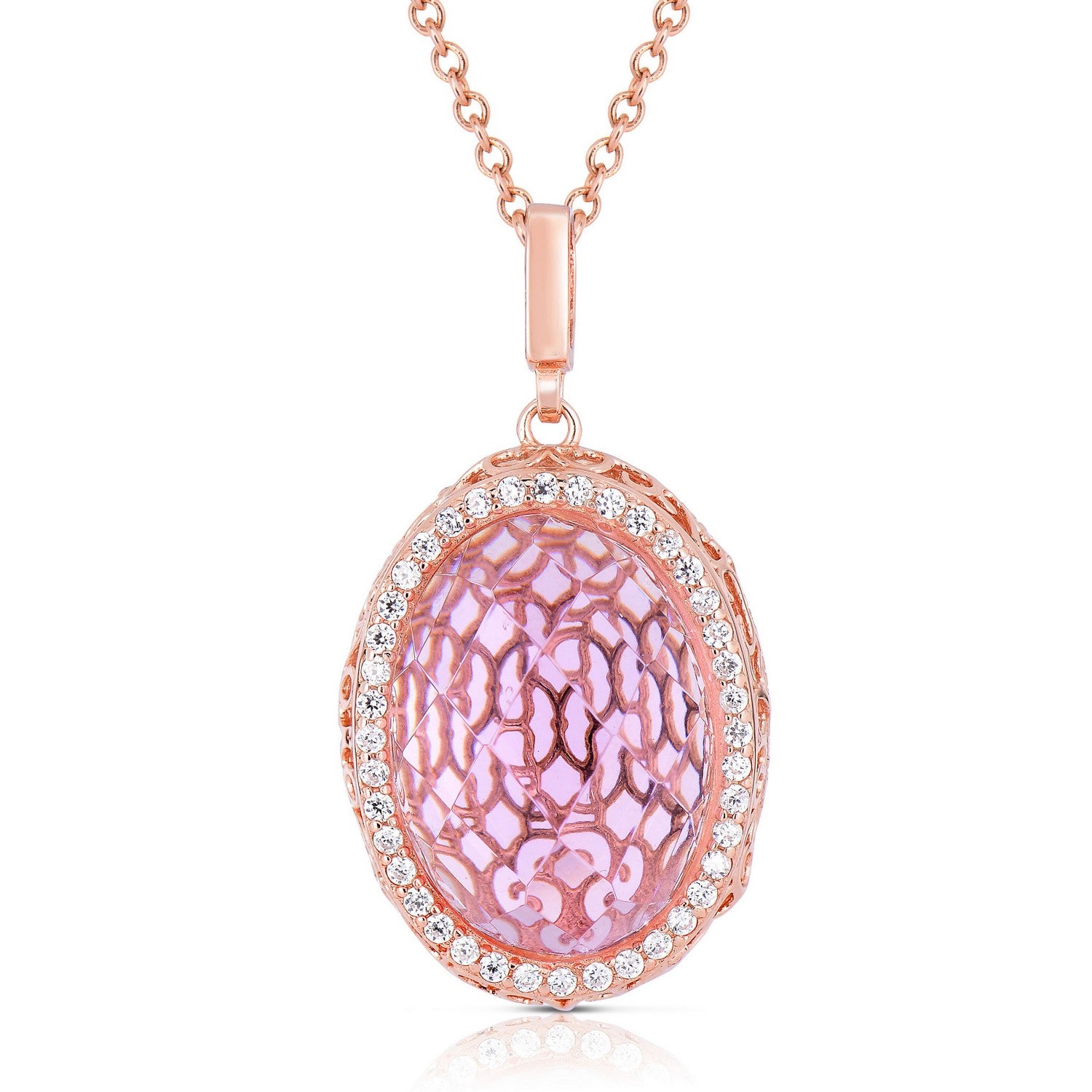 This dainty rose plated pendant features a pink oval cubic zirconia stone outlined with white round smaller stones. Crafted of .925 Sterling silver, the necklace secures with a spring ring clasp.