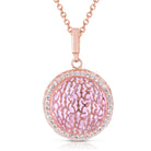 This dainty rose plated pendant features a pink round cubic zirconia stone outlined with white smaller ones. Crafted of .925 Sterling silver, the necklace secures with a spring ring clasp.