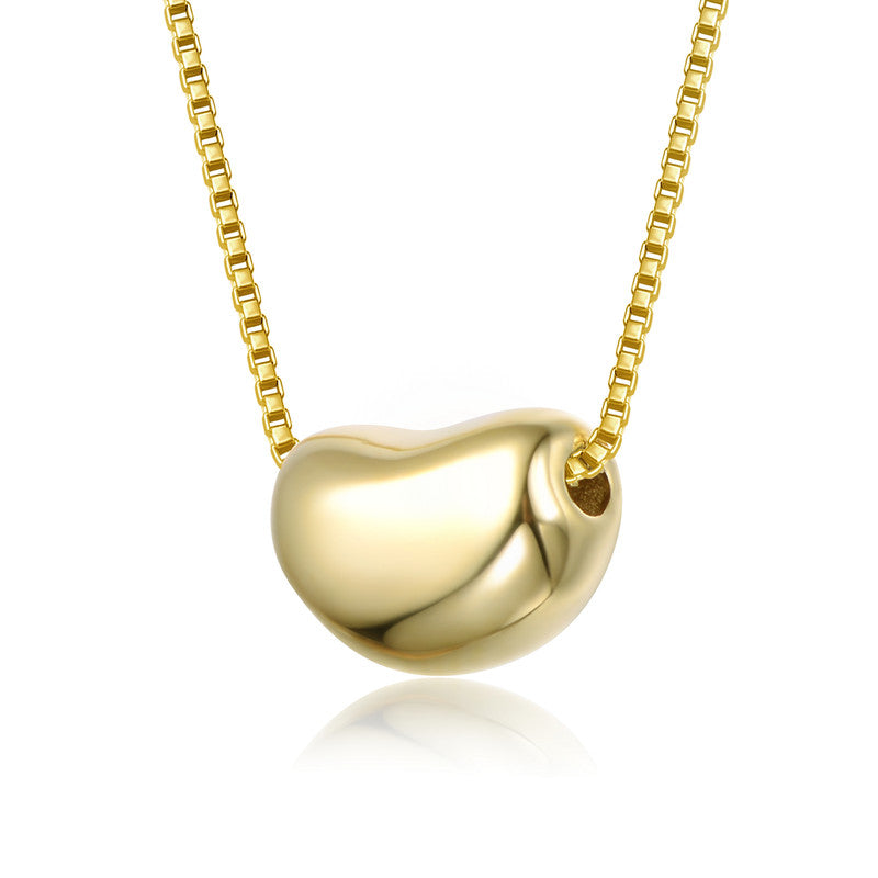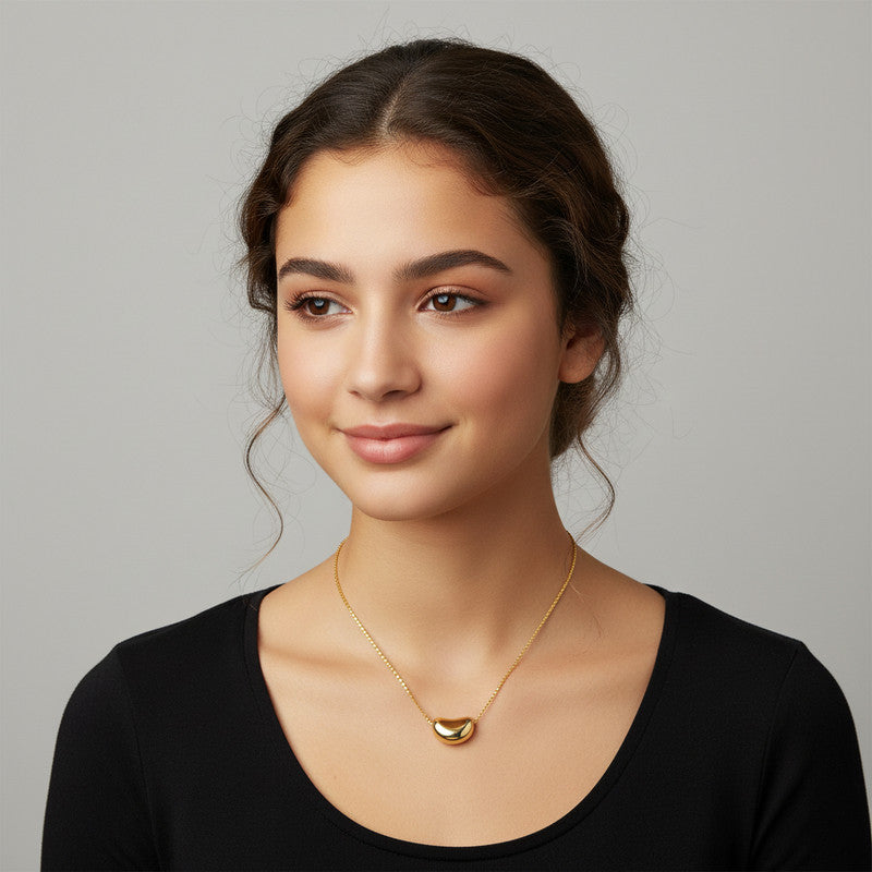 This elegant necklace features a smooth bean-shaped pendant that embodies modern minimalism and effortless sophistication. Finished in radiant 14K gold plating, it offers a warm glow that complements any skin tone. The sleek silhouette makes it perfect for layering or wearing solo as a refined statement. Designed for everyday elegance or special occasions, this timeless piece adds subtle charm and contemporary style to any jewelry collection.