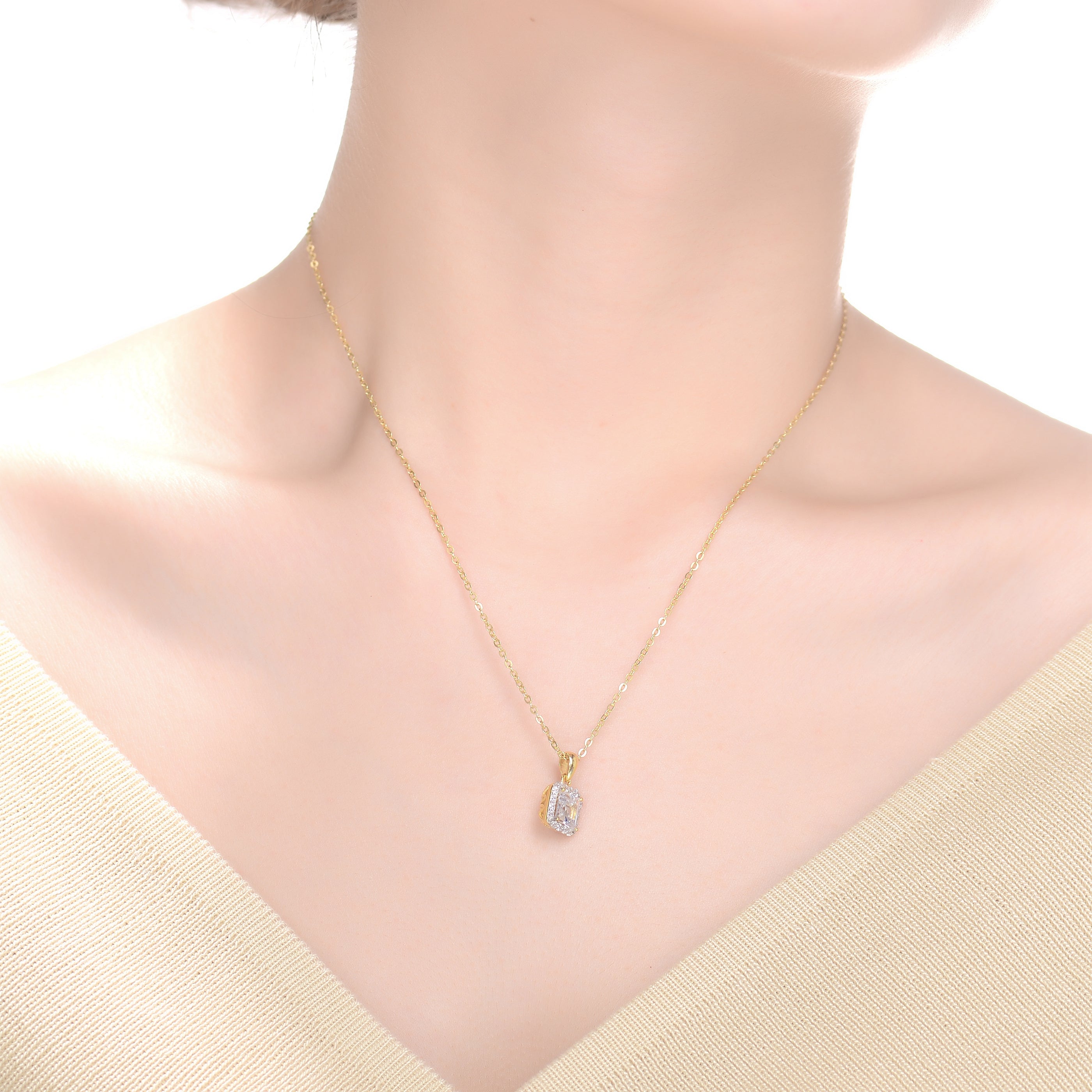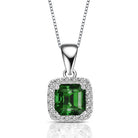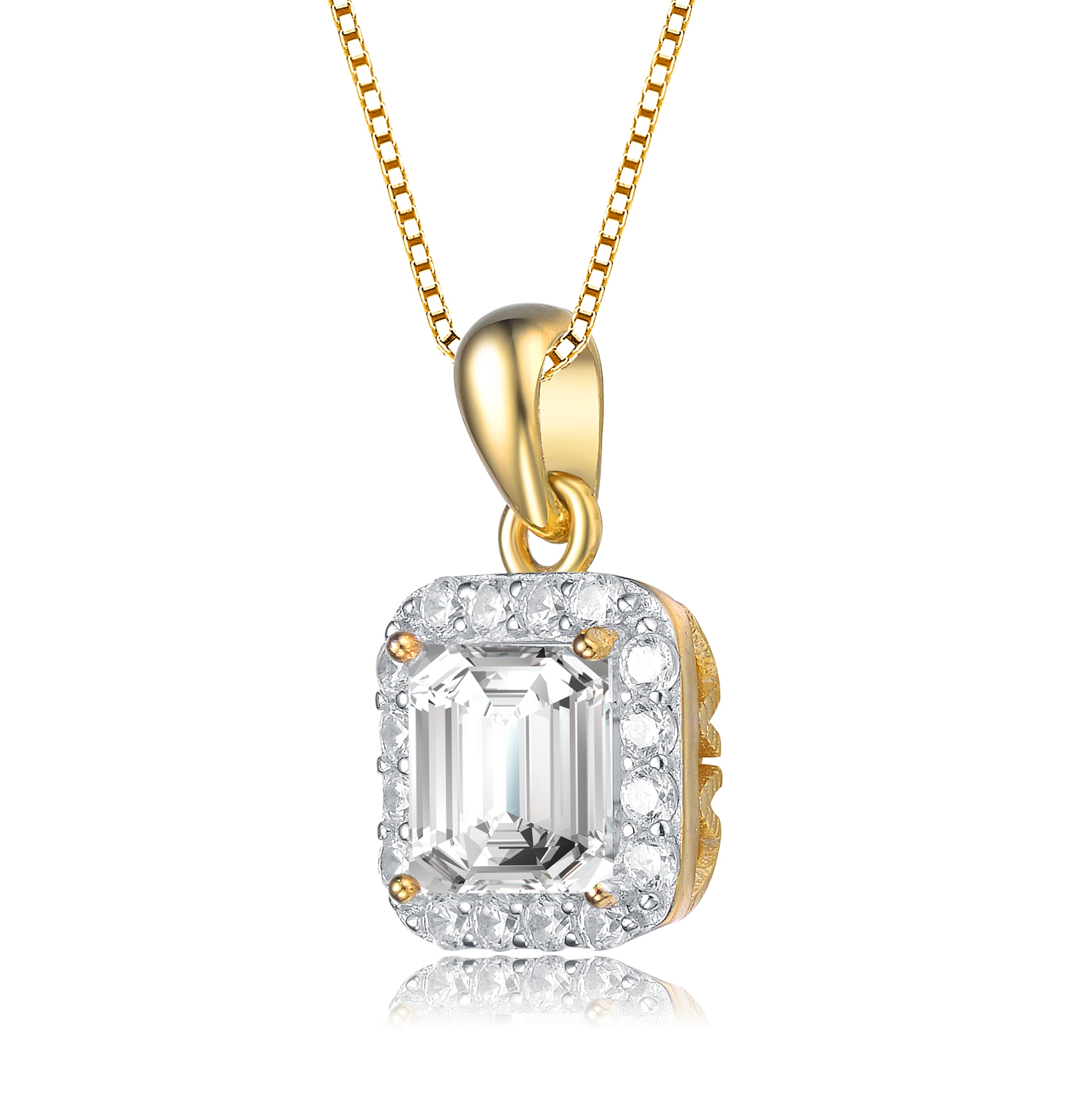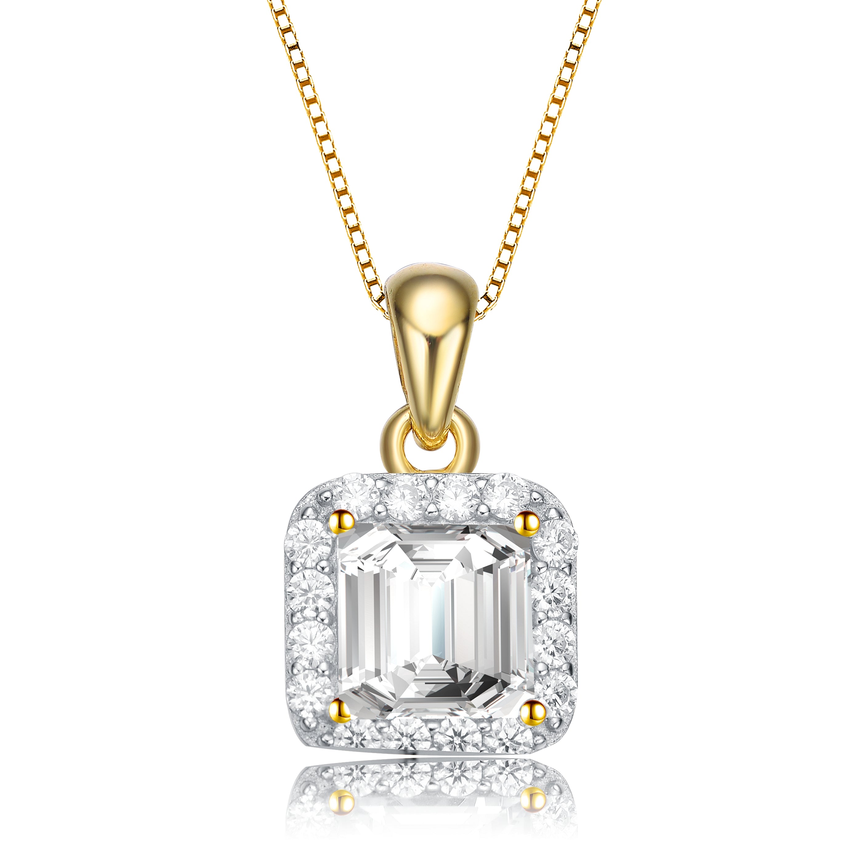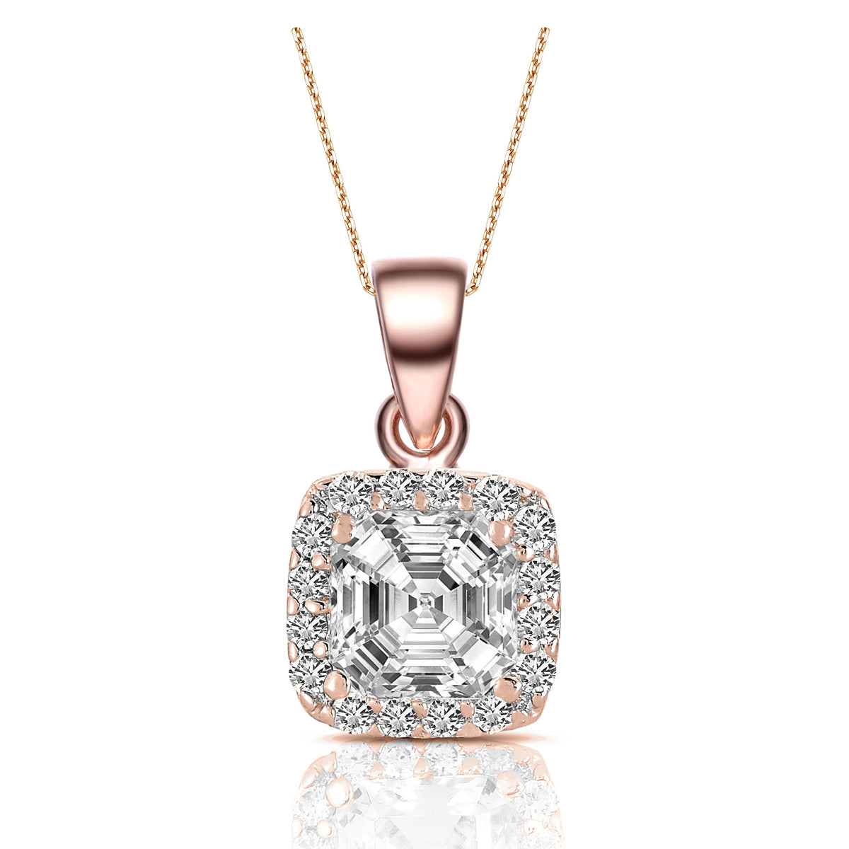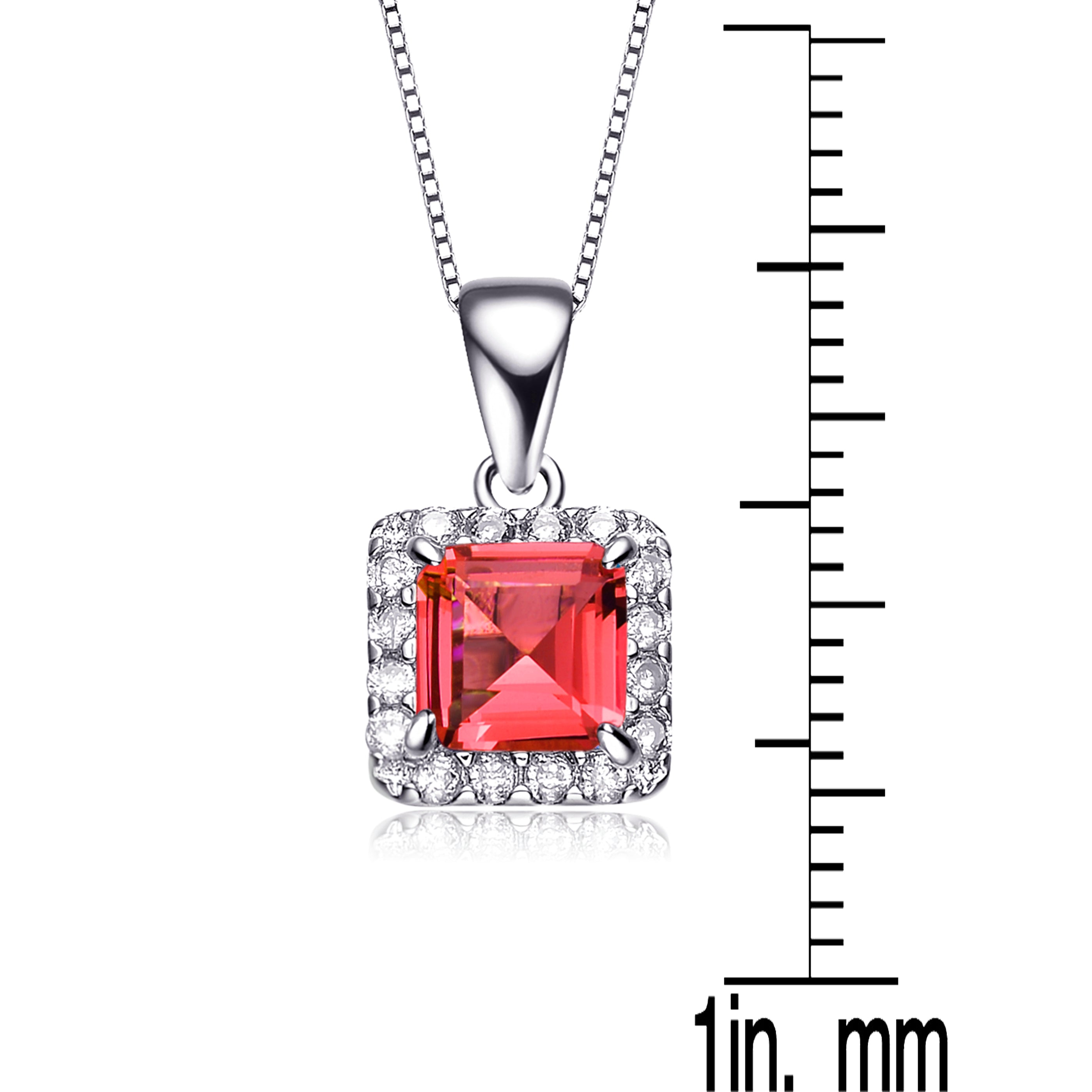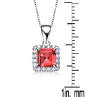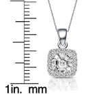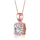 Fine-quality Ascher-cut clear cubic zirconia stone is surrounded by brilliant round cubic zirconia stones on this pendant. Crafted of .925 Sterling silver with White Gold plating, the necklace secures with a spring ring clasp. Available in a variety of colors, for the choice.