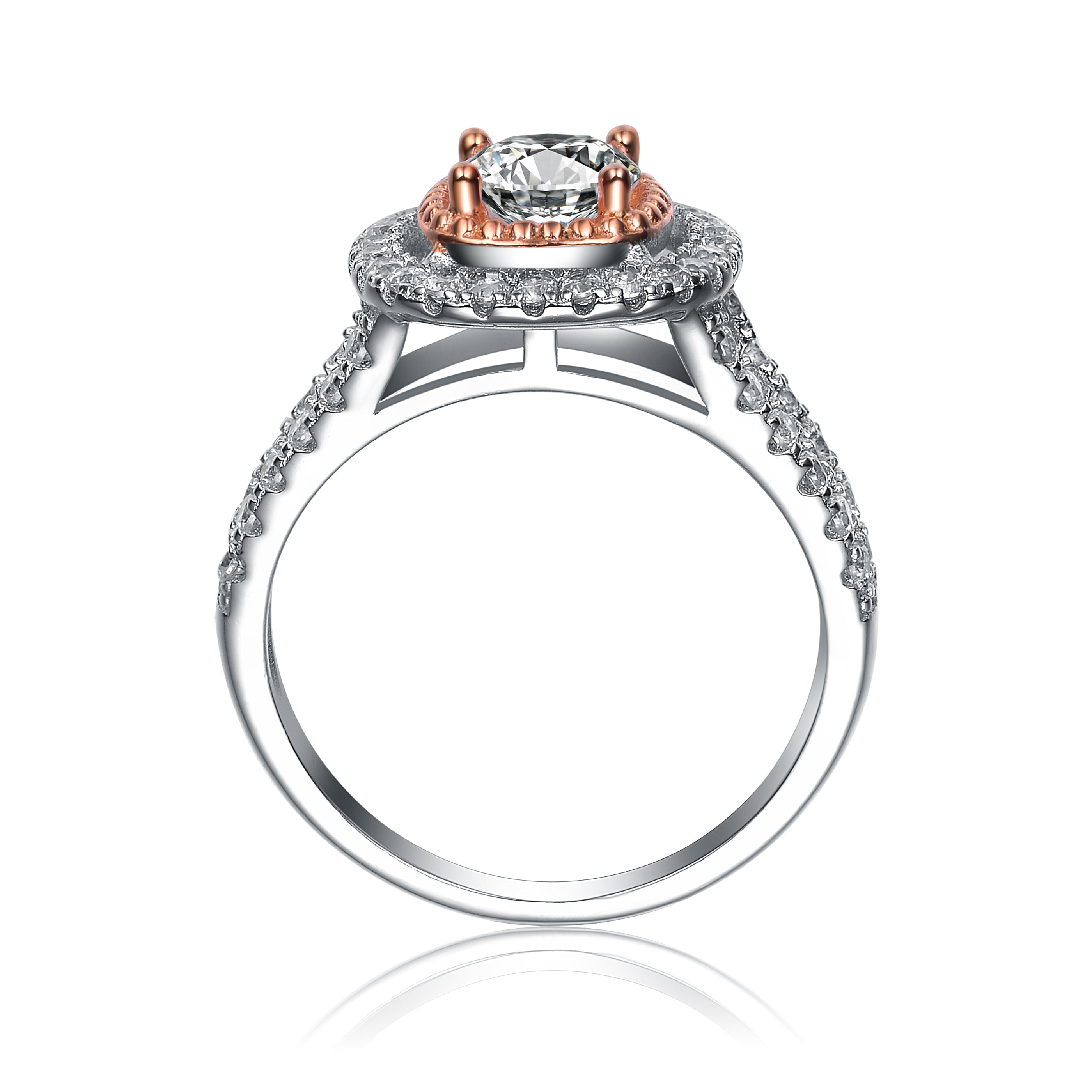 Stylish .925 Sterling silver rose gold plated cubic zirconia double halo ring. This ring features a hint of rose gold overlay, large clear round cubic zirconia stone in the center accented by small clear round cubic zirconia stones on the frame as well as on the split band. crafted of .925 Sterling silver in rhodium and rose gold plating and it is available in 6, 7, 8 size.