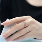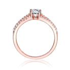 Elegant .925 Sterling silver rose gold plated cubic zirconia Modern ring. This ring features an interesting shape with three split sides of the band, paved with clear round cubic zirconia stones. At the center sits a large clear round cubic zirconia in prong setting. Crafted of .925 Sterling silver with rose gold plating and it is available in sizes 6, 7, 8. Makes a great gift as well.