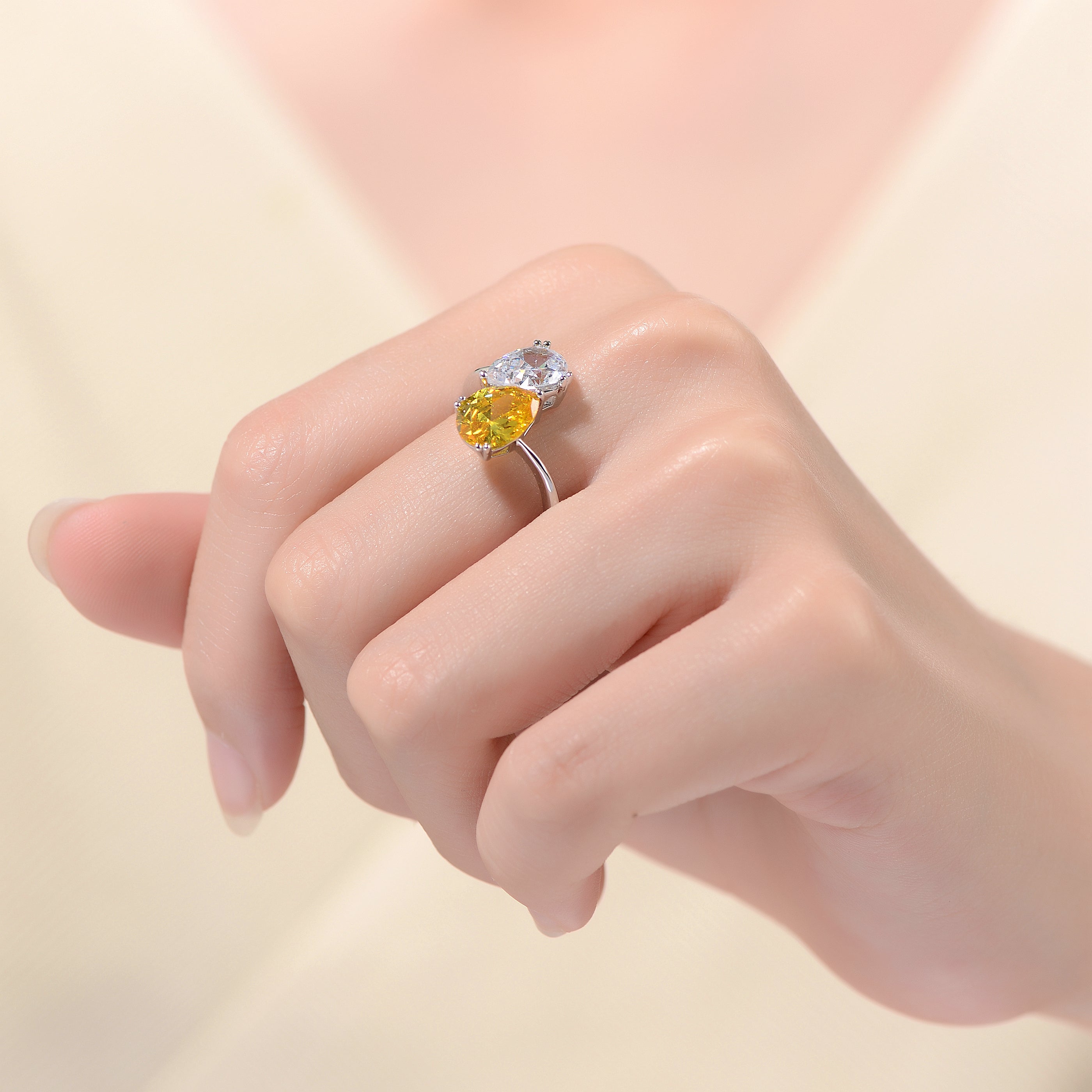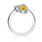 This unique bypass ring features two elegant pear-shaped cubic zirconia stones. One yellow stone and one clear stone balance each other beautifully. The open-ended design adds modern sophistication. Crafted in rhodium plated sterling silver, it delivers a bright polished finish. The sculptural form draws attention without feeling heavy. A refined statement ring with contemporary flair.